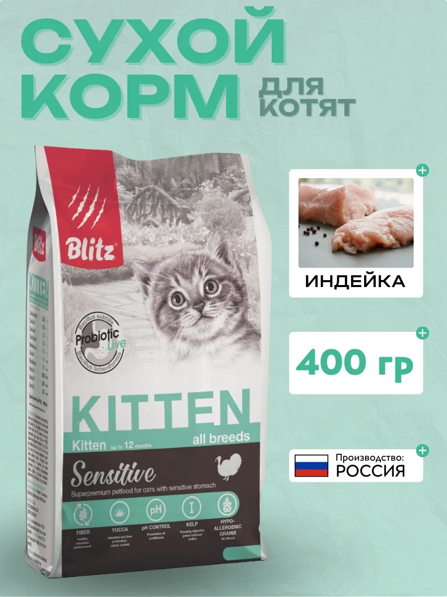 Blitz Sensitive Kitten All BreedsСбалансированный сухой корм класса супер премиум обеспечивает особые потребности растущих котят, но также может быть использован для беременных и кормящих кошек: Blitz Kitten содержит оптимальный баланс белков, жиров и других питательных веществ. Живые пробиотики, добавленные в формулу корма "Блиц" для котят, способствуют правильному росту и развитию малышей, стимулируют формирование крепкого иммунитета. Входящий в состав корма фенхель снижает газообразование и успокаивает кишечник. Сухой корм Blitz с индейкой для котят, беременных и кормящих кошек учитывает особенности нежного и чувствительного пищеварительного тракта котёнка, а также необходимость в энергии для игр и познания мира.В чём преимущества Blitz Kitten для котят?Оптимальное содержание мясных белков, жиров и энергии обеспечивают особые потребности растущих котят, корм может быть использован для беременных и кормящих кошек.Содержащиеся в корме пробиотики улучшают усвояемость корма и поддерживают иммунитет.Корм содержит ненасыщенные жирные кислоты Омега-3 и Омега-6, обеспечивающие иммунитет, здоровую кожу и отличную шерсть.Корм включает качественные низкоаллергенные зерновые культуры: рис и кукурузу. Не содержит пшеницу, зачастую являющуюся причиной аллергии.Экстракт Юкки Шидигера улучшает пищеварительный процесс, снижает метеоризм и уменьшает запах фекалий.