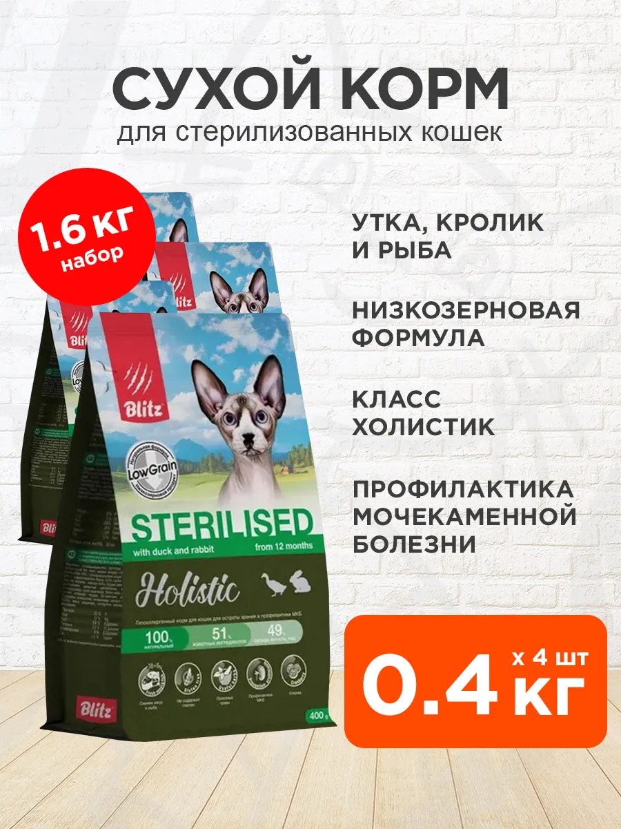 BLITZ Корм сухой Holistic для стерилизованных кошек утка 0,4кг 4шт
