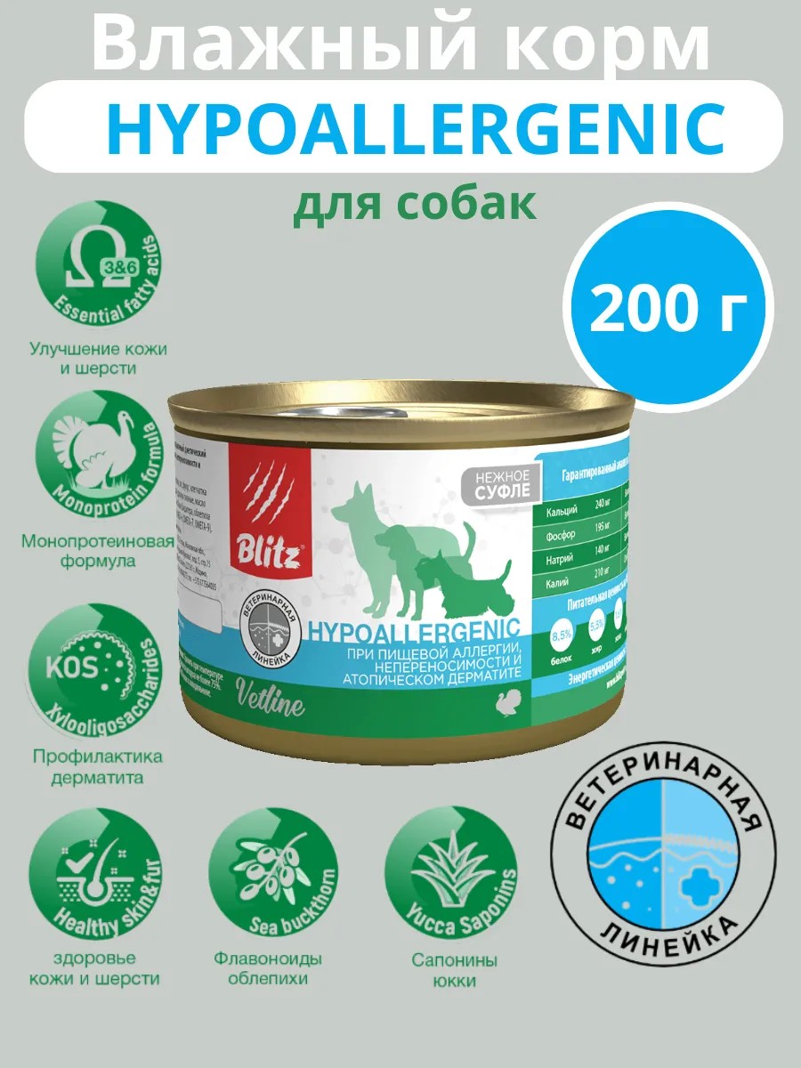 Влажный корм BLITZ hypoallergenic - это специально разработанное питание для взрослых собак старше года, склонных к пищевой аллергии или страдающих атопическим дерматитом. Влажный корм hypoallergenic для собак представляет собой полнорационное диетическое питание, разработанное для обеспечения потребностей собак в белках, жирах, клетчатке, витаминах и минералах. Используемые в составе дополнительные компоненты позволяет питомцам быстрее восстановить нормальное пищеварение и целостность кожно-шерстного покрова, а также избежать рецидивов пищевой непереносимости и кожных воспалений аллергического характера.Его уникальная формула, основанная на нежном суфле из индейки и риса, обогащена полезными добавками, такими как фукус, клетчатка свекловичная, масло лосося и витаминно-минеральный комплекс. BLITZ hypoallergenic поможет вашему питомцу сохранить здоровье кожи и шерсти, а также обеспечит ему все необходимые питательные вещества для активной жизни. Корм подходит для собак всех пород и легко усваивается даже чувствительным желудком.