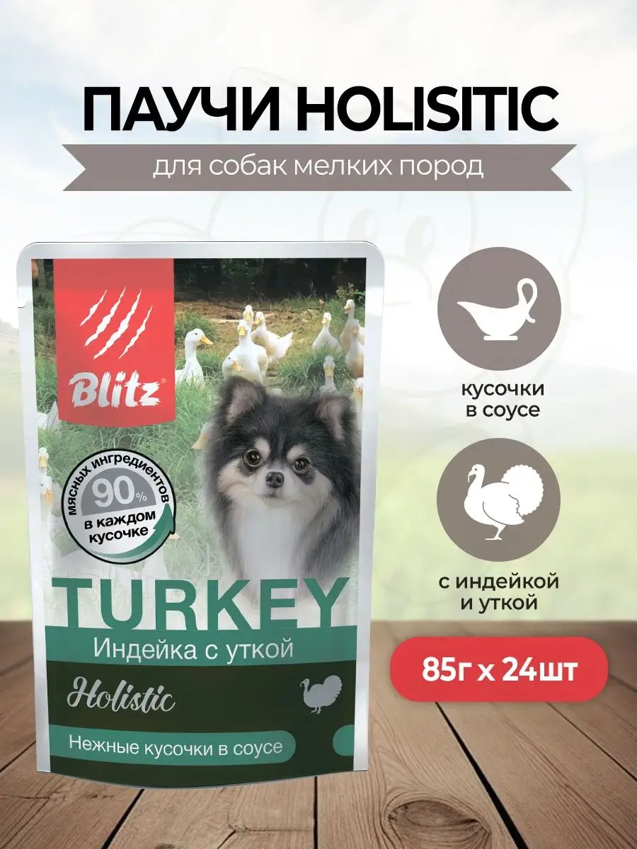 Blitz Holistic Turkey and Duck wet food (tender pieces in gravy) is formulated with the sensitive digestion of small and miniature dogs in mind. It contains no chicken protein, grains, soy, starch, preservatives, or flavorings—any ingredients that could cause allergies or intolerances in pets. Instead, it contains up to 90% high-quality meat ingredients in every bite! They are easily digestible and provide active "little ones" with energy all day long. Duck and turkey (at least 22%), by-products, peas (not more than 2.2%), fish oil, Jerusalem artichoke extract, Yucca schidigera extract, vitamins and minerals, taurine. Crude protein 8.00% Crude fat 4.00% Crude ash 2.00% Crude fiber 0.30% Moisture 84.00% Vitamin A 1830 IU Vitamin D3 29 IU Vitamin E 2.1 mg Taurine 32 mg Calcium 0.23 mg Phosphorus 0.16 mg Magnesium 60 mg Zinc 3 mg Sodium 100 mg Energy value 66 kcal/278 kJ