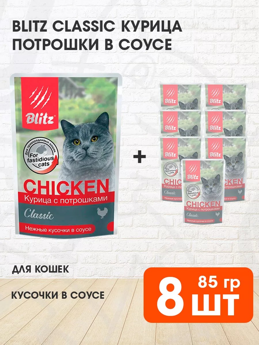 Blitz для кошек влажный - полнорационный консервированный корм для взрослых кошек с курицей и потрошками в нежном желе, с функцией поддержки здоровья кожи и шерсти.