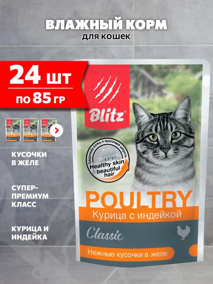 Blitz для кошек влажный - полнорационный консервированный корм для взрослых кошек с курицей и индейкой в нежном желе, с функцией поддержки здоровья кожи и шерсти.