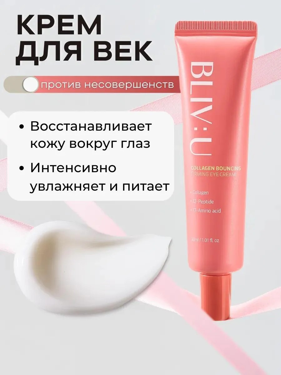 BLIV:U Collagen Bouncing Firming Eye Cream, a moisturizing and cooling eye cream, soothes the skin, hydrates, and smoothes fine lines. This anti-aging eye cream reduces dark circles and puffiness, evens out skin tone, and inhibits pigmentation. Its powerful formula contains everything needed for effective rejuvenating skin care: 5% panthenol, 9% lactobacilli, and 2% niacinamide. Niacinamide also lightens blackheads, reduces comedones, and reduces shine. A complex of 12 peptides firms the skin, provides a powerful lifting effect, and reduces wrinkle depth. This eye cream makes an excellent makeup base, as it absorbs quickly, leaves a non-sticky feeling, and won't crease. Suitable for day and night use, it can be applied not only to the eyelids but also targeted to the face, specifically targeting deep wrinkles. Choose the best facial care products from leading Korean cosmetics brands. Fragrance-free. pH 5.5.