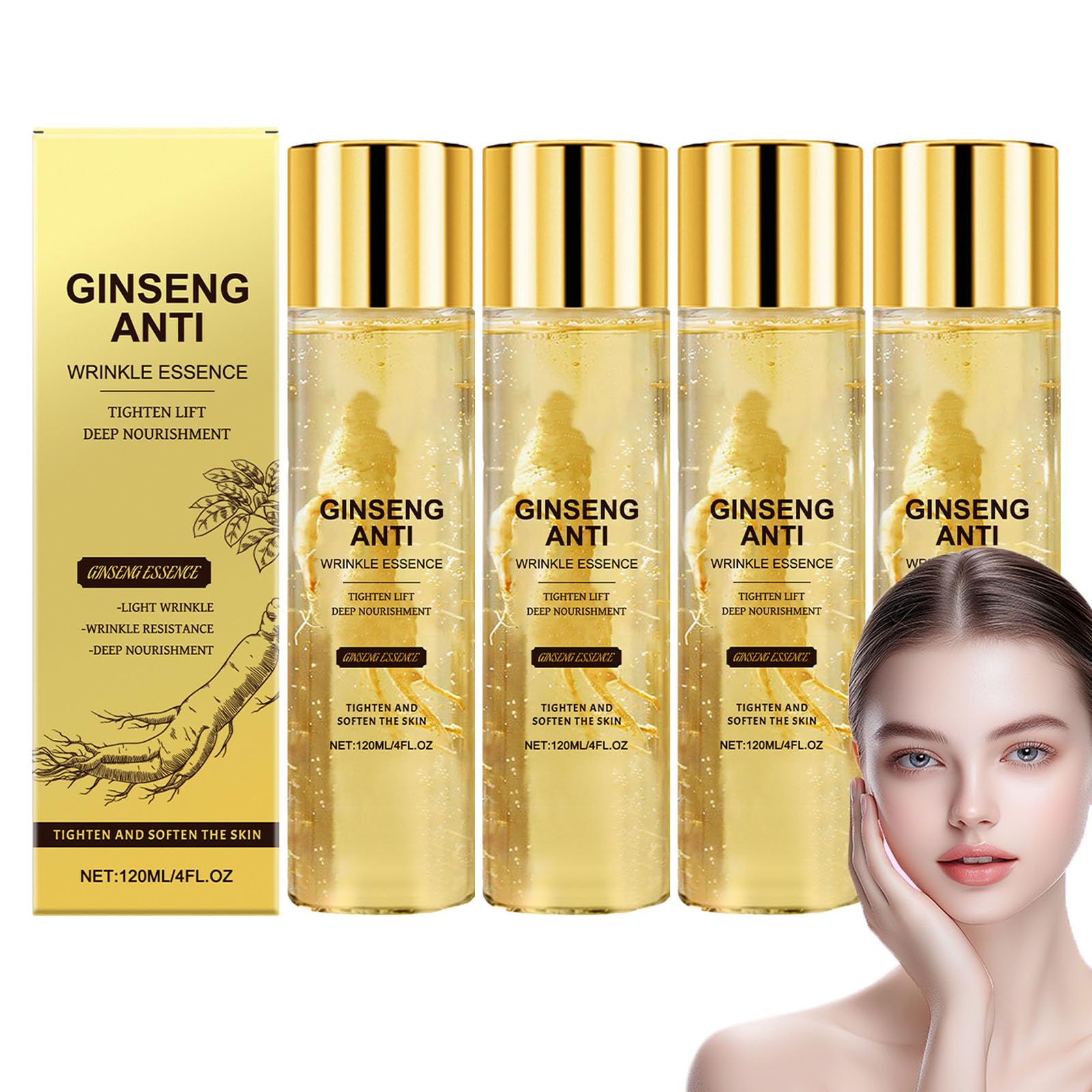 Ginseng Essence Water, Anti-Wrinkle Essence, 4-in-1 Ginseng Essence, Moisturizing Anti-Aging Essence Water, Firming, Natural Anti-Aging Moisturizing Essence Water with Ginseng, Moisturizing and Anti-Wrinkle Treatment, Moisturizer with Ginseng Extract, Anti-Wrinkle Firming Serum, Ginseng Facial Liquid Essence, Original Anti-Wrinkle Serum Oil with Ginseng Extract, Anti-Aging Serum with Ginseng Polypeptides Specifications: Name: Ginseng Anti-Wrinkle Essence Volume: 120 ml Package Contents: 1 2 3 4 pieces Ginseng Anti-Wrinkle Essence Note: 1. Please allow slight variations in size due to manual measurement. Thank you for your understanding. 2. Monitors are not calibrated the same way therefore, the color of the item shown in the photos may be slightly different from the actual product. Please refer to the actual color. 3. Please contact us at any time if you have any questions we will provide the most satisfactory solution within 24 hours. SAFETY WARNING Store in a cool, dry place away from sunlight. Keep out of reach of children.Directions – Cleanse and dry your face. Apply an appropriate amount of ginseng essence evenly to your face. Gently massage until fully absorbed. Suitable for all skin types – This hydrating essence is composed of gentle ingredients and is suitable for dry, oily, and sensitive skin, for beautiful, radiant skin. Fast absorption – This anti-aging ginseng serum has a light, non-greasy texture that penetrates deeply into the skin and is quickly absorbed without leaving any residue, leaving skin smooth and delicate. Intense hydration – This anti-wrinkle ginseng serum locks in moisture for a long time, deeply hydrating and nourishing the skin, leaving it soft and moisturized. Reduces fine lines – Our natural ginseng essence water contains ginseng extract, which can reduce wrinkles and fine lines, delay aging, and make skin firm and elastic.Eau hydratante anti-âge au ginseng, essence anti-rides 4 en 1 au ginseng, sérum raffermissant au ginseng doré, tonique hydratant anti-âge, extrait liquide de ginseng, hydratant et éclaircissant (4)DESCRIPTION DU PRODUIT DESCRIPTION DU PRODUIT Description du produit Eau d'essence de ginseng, Essence anti-rides, Essence de ginseng 4 en 1, Eau d'essence anti-âge hydratante, Raffermissante, Eau d'essence hydratante naturelle anti-âge au ginseng, Soin hydratant et anti-rides, Hydratant à l'extrait de ginseng, Sérum raffermissant anti-rides, Essence liquide pour le visage au ginseng, Huile sérum originale anti-rides à l'extrait de ginseng, Sérum anti-âge aux polypeptides de ginseng Spécifications : Nom : Essence anti-rides au ginseng Contenu : 120 ml Contenu de l'emballage : 1 2 3 4 pièces Essence anti-rides au ginseng Remarque : 1. Les mesures étant prises à la main, de légères variations de taille sont possibles. Merci de votre compréhension. 2. Les écrans ne sont pas calibrés de la même manière la couleur de l'article affichée sur les photos peut donc être légèrement différente de la réalité. Veuillez prendre la couleur réelle comme référence. 3. Veuillez nous contacter à tout moment si vous avez des questions, nous vous donnerons la solution la plus satisfaisante dans les 24 heures. AVERTISSEMENT DE SÉCURITÉ Conserver dans un endroit frais et sec, à l'abri du soleil. Tenir hors de portée des enfants.Mode d'emploi – Nettoyez votre visage et séchez-le. Appliquez une quantité appropriée d'essence de ginseng uniformément sur votre visage. Massez délicatement jusqu'à absorption complète. Convient à tous les types de peau – Cette essence hydratante est composée d'ingrédients doux et convient aux peaux sèches, grasses et sensibles, pour une peau belle et éclatante. Absorption rapide – Ce sérum anti-âge au ginseng possède une texture légère et non grasse qui pénètre profondément dans la peau et est rapidement absorbé sans laisser de résidus, laissant la peau lisse et délicate. Hydratation intense – Ce sérum anti-rides au ginseng retient l'hydratation durablement, hydrate et nourrit la peau en profondeur, la laissant douce et hydratée. Réduit les ridules – Notre eau d'essence naturelle de ginseng contient de l'extrait de ginseng, qui peut réduire les rides et ridules, retarder le vieillissement et rendre la peau ferme et élastique.