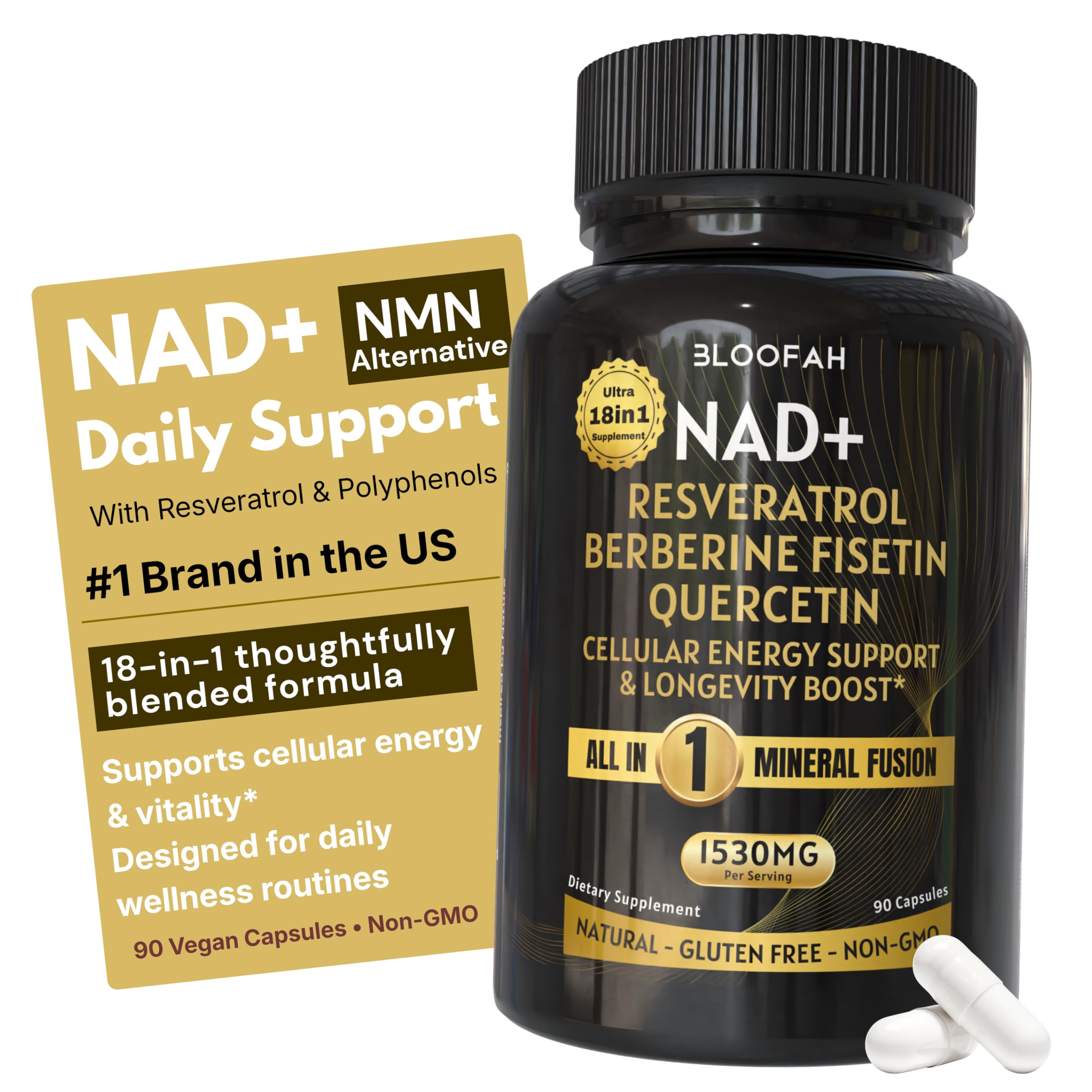 Bloofah NAD+ Supplement 1530mg - Nicotinamide Riboside with Resveratrol 18 in 1 Herbal Supplement + Green Tea for Women & Men Cellular Energy, Healthy Aging Support | 90 Vegan Capsules