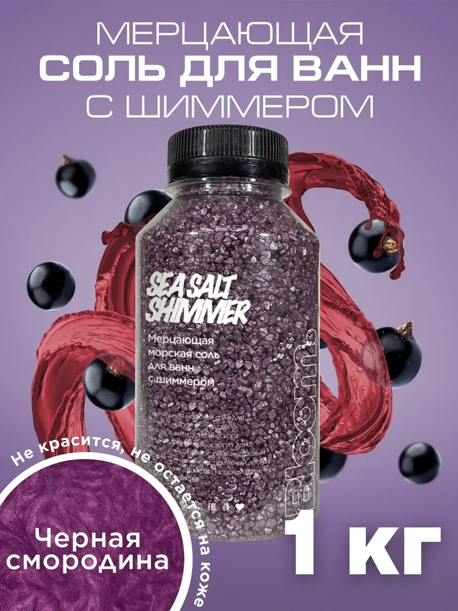 Наша ароматизированная соль не оставляет следов на коже и ванне, не вызывает аллергии. Шимер на теле можно легко смыть теплой водой. Наполните ванну теплой водой, растворите в ней соль и пробудите эту магию купания. В составе шиммера для ванны только натуральные компоненты, которые подходят для купания детей и взрослых. Мы используем израильскую морскую соль с магнием, в составе которой находится большое количество микроэлементов и полезных веществ. Магниевая соль имеет расслабляющий и восстановительный эффект, оказывает антистресс действие, глубоко ухаживает за кожей и увлажняет её, оказывает антицеллюлитный эффект и помогает в похудении. В каждом доме в ванной комнате обязательным продуктом для ухода за кожей и телом, помимо геля для душа, должна быть морская соль для ванны. Вес нетто соли - 1000 грамм. Парфюмированную соль можно использовать в сочетании с пеной или бомбочкой для ванн для еще большего расслабления в конце дня. Блестящий набор для СПА от Bloom. - это прекрасный подарок на День Рождения, Новый Год и любой другой праздник маме, ребенку, девушке или подруге. В нашей коллекции представлены 6 цветов блестящей соли с потрясающими ягодными и фруктовыми ароматами на любой вкус. Лесные ягоды, кокос, бабл гам, кока кола, черная смородина, сочный арбуз…а какой выберешь ты?