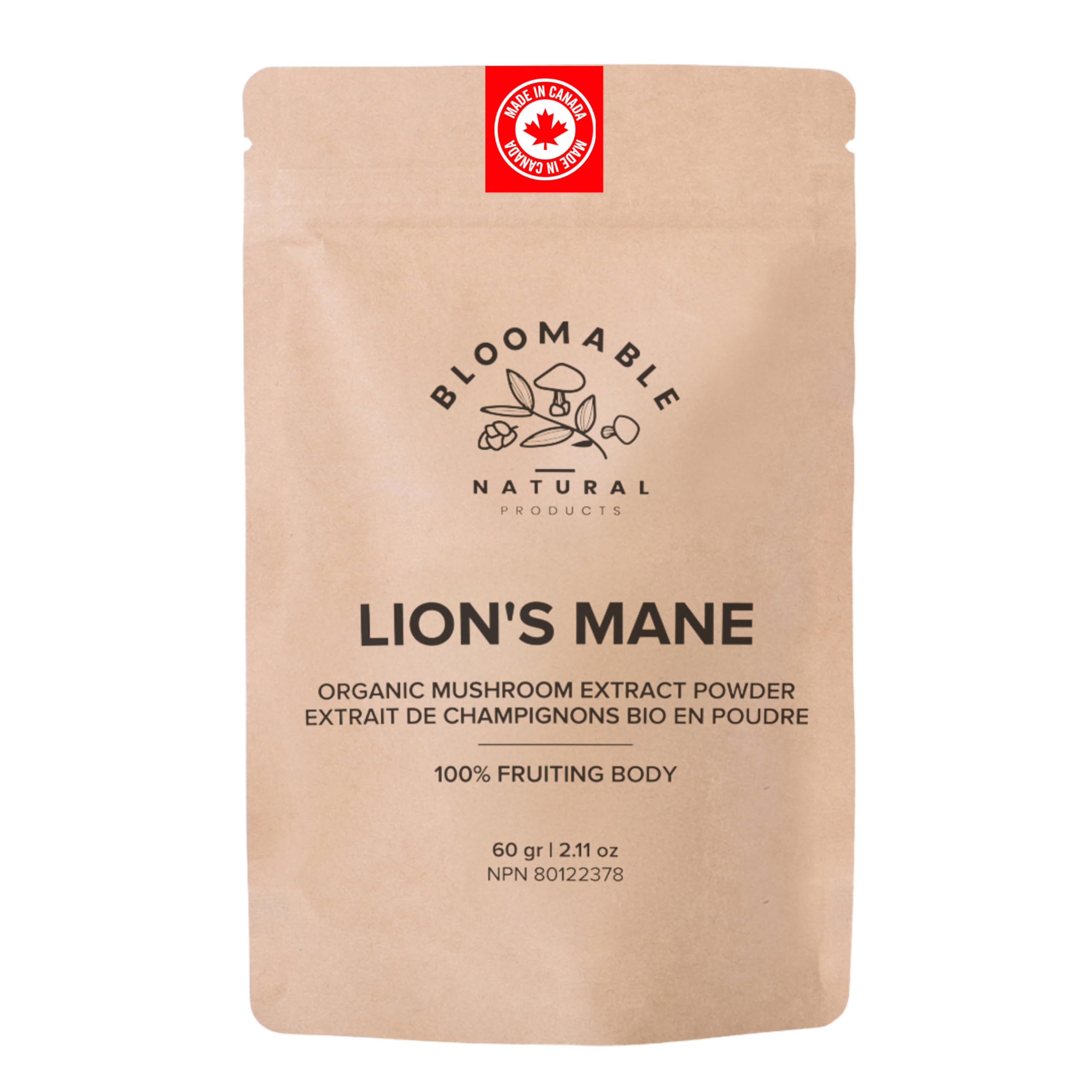 At Bloomable: We own our supply chain through vetted and trusted suppliers. Our products contain 100 organic mushrooms, carefully manufactured and tested in Canada. NPN 80123147. How to Use: Adults take 1 tsp (3 gr) daily with coffee, hot tea, or smoothies. Benefits build over time. Ingredients: Organic, adaptogenic, and hand harvested Lion's Mane Mushroom. Grown on wood. 100 fruiting body mushroom no added fillers, starch, grains or mycelium. Benefits: Cognitive enhancement, nervous system support, mood and well-being. Lion's Mane Mushroom Powder: Made using Lion's Mane mushroom that is grown on wood, Lion's Mane is a source of fungal polysaccharides with immunomodulating properties.