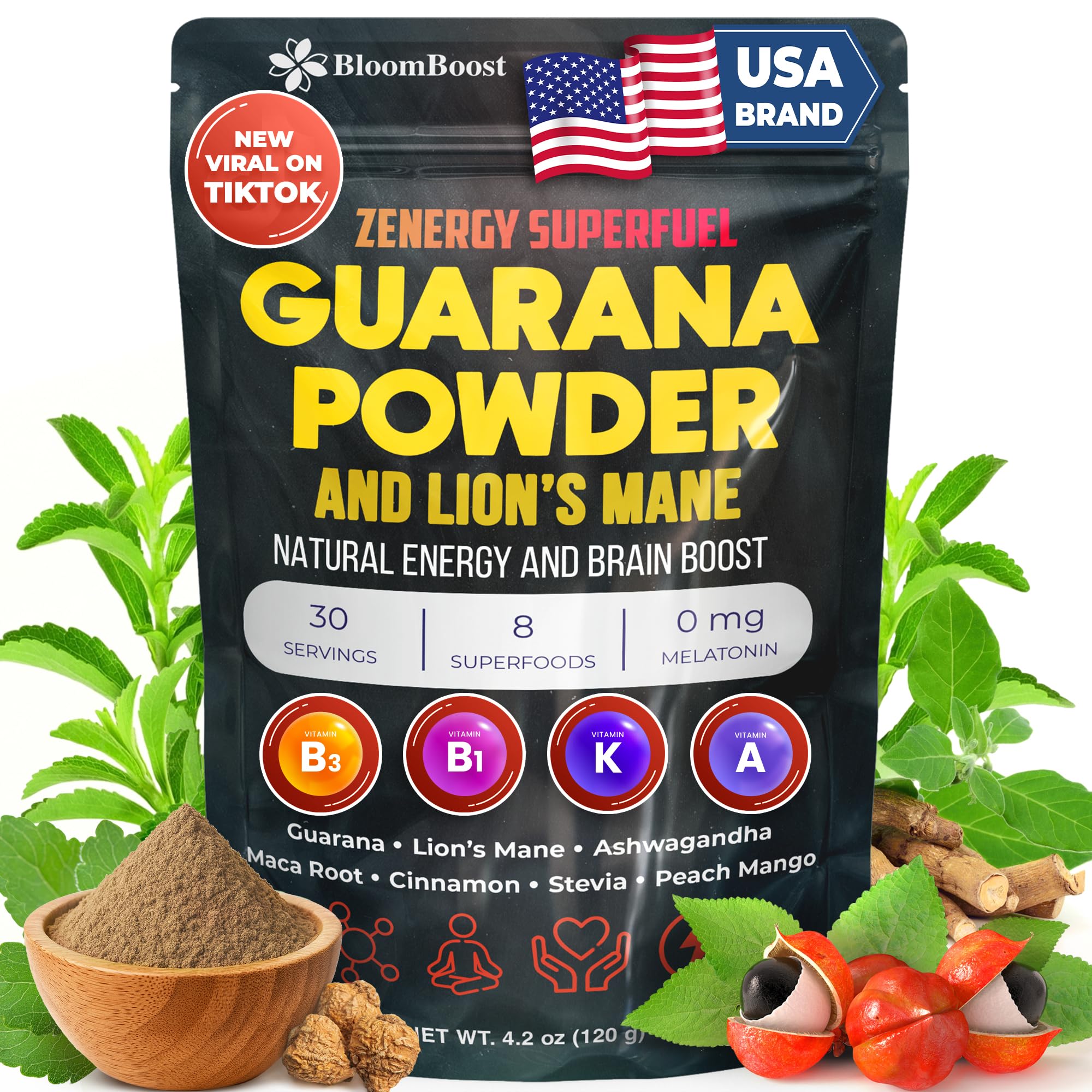 BloomBoost Guarana Powder 1 000mg Per Serv - Lion s Mane Ashwagandha Maca ... Natural Caffeine Energizer Brazilian Herbal Extract Bulk Superfood Vegan Friendly & Non-GMO - 4.2oz (30 Servings)