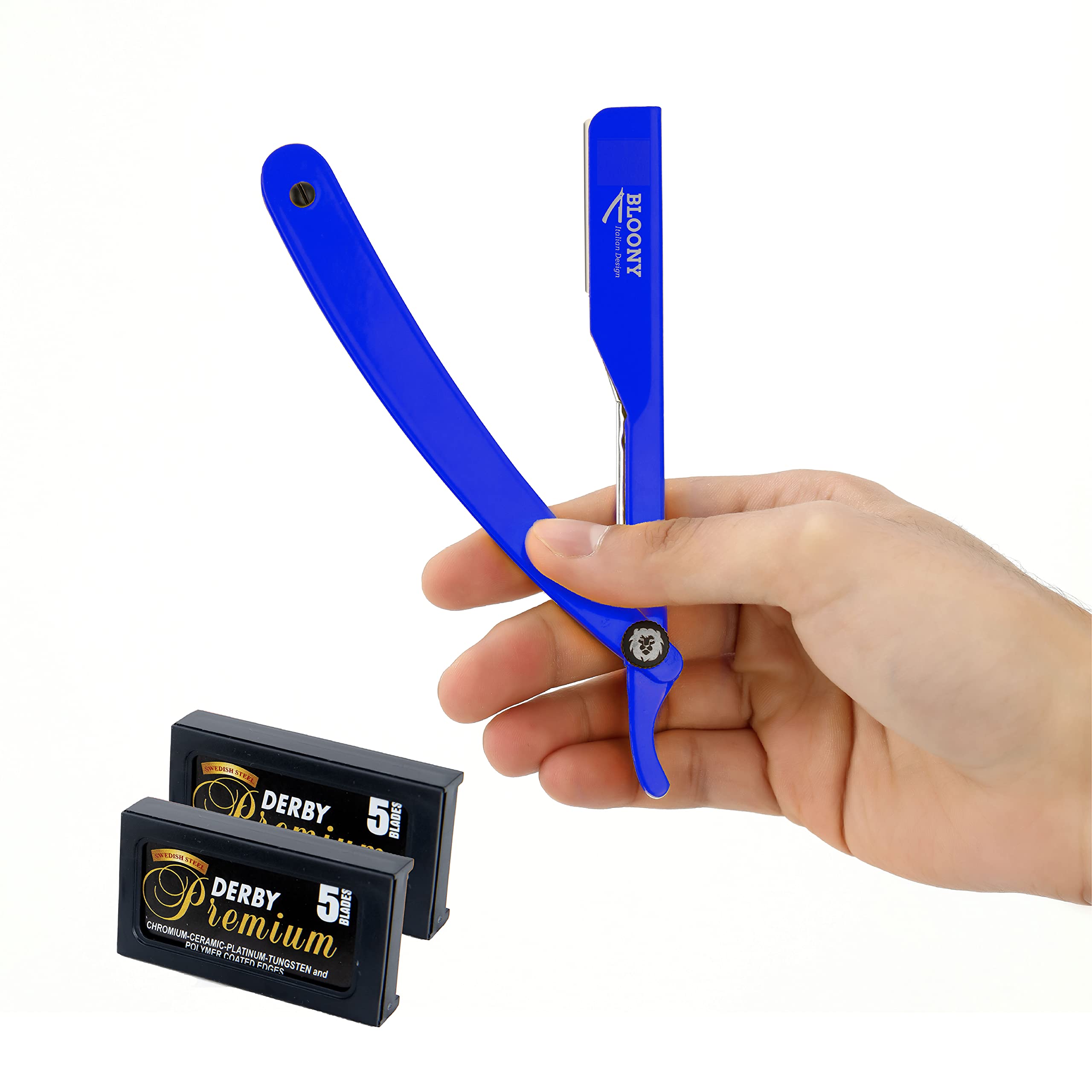 Bloony Laser Collection of Professional Free Hand Razor - Stainless Steel + 10 Derby Platinum Razor Blades (20 Half Blades) - Italian Design - Version 2021 (Blu)
