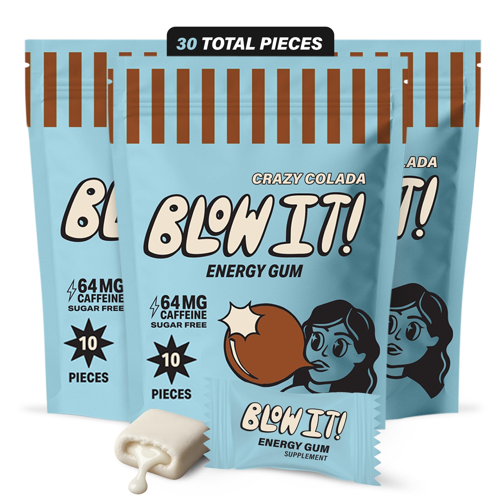Blow It - Caffeinated Xylitol Gum - Intensified Energy and Focus Boost Effect - Green Coffee Bean Infused Sugar Free Gum - Crazy Colada Flavor - 3-Pack (30 Pieces)