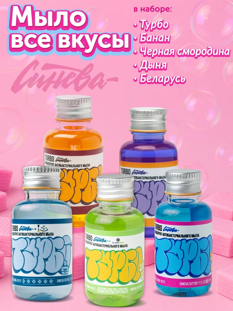 Набор всех вкусов концентрата антибактериального мыла “Турбо” профессиональной тату косметики “Синева”.