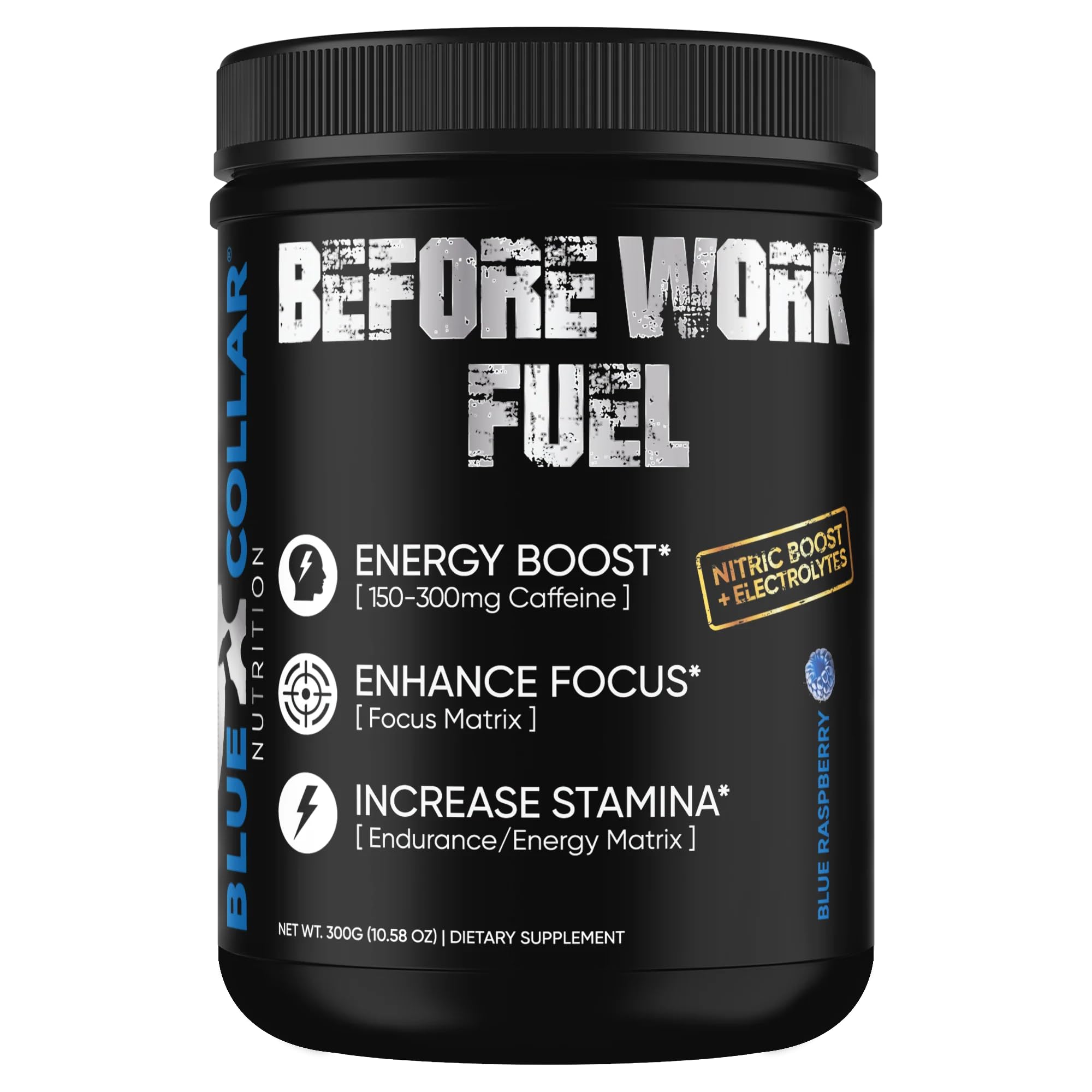 When the alarm rings for another demanding day, you need more than just a quick burst of energy — you need consistent, reliable fuel. Blue Collar Nutrition Before Work Fuel is formulated to support sustained energy, focus, and endurance, helping you perform at your best throughout the toughest workdays. This pre-work formula combines amino acids, electrolytes, and performance nutrients to help promote focus, alertness, and muscular endurance. Its Focus Matrix, featuring L-Theanine and L-Tyrosine, supports mental clarity and concentration so you can stay sharp and steady all day. For those who rely on physical strength and stamina, the Energy Endurance Matrix includes Creatine Monohydrate to help support muscle energy production and performance during demanding activity. Hydration and performance go hand in hand — that's why Before Work Fuel also contains a Nitric Oxide and Electrolyte Blend, including Citrulline, to support circulation, hydration, and overall readiness. Available in a refreshing Fruit Punch flavor, Before Work Fuel delivers a clean, invigorating experience free from artificial additives. Built for those who put in the work — this is the fuel that keeps you going.QUALITY YOU CAN TRUST – Manufactured in an FDA-registered, GMP-certified facility and third-party lab tested to ensure purity, safety, and quality in every batch. NITRIC OXIDE ELECTROLYTE BLEND – Includes Citrulline and electrolytes to help support hydration, circulation, and overall performance — ideal for physically demanding shifts. ENDURANCE PERFORMANCE SUPPORT – The Energy and Endurance Matrix includes Creatine Monohydrate and amino acids to help support muscular energy and endurance during active workdays. PROMOTE FOCUS CLARITY – Features a Focus Matrix with L-Theanine and L-Tyrosine to help promote alertness, concentration, and mental clarity — so you can stay sharp and consistent on the job. SUPPORT LASTING ENERGY – Fuel your performance with Blue Collar Nutrition Before Work Fuel, designed to support sustained energy and focus throughout long, demanding workdays.