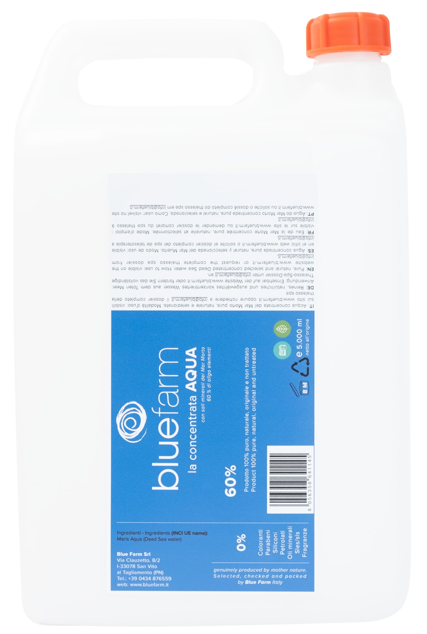 Dead Sea water contains a unique set of salts enriched with magnesium, sodium, potassium, calcium, bromine, iron, selenium, zinc and relatively high concentrations of sediments Dead Sea water has a high specific gravity and great buoyancy making it extremely easy to float on its surface. The extraordinary composition of the Dead Sea water results from the evaporation of seawater through the crystallization of minerals, the addition of salts from terrestrial sources, the erosion of rocks and the dissolution of sediments. Salt water also contains high concentrations of sediment. Thanks to the balneotherapeutic properties of the sulphides in the thermo-mineral springs, the Dead Sea area has become a world-famous bathing and spa facility. It is known for the treatment of rheumatic diseases, including rheumatism of muscles and soft tissues, disc diseases or other diseases of the spine. INGREDIENTS Maris AquaIt has a grayish, powdery color. It is available in a package. from 0.5 and 2 Kg Other sizes on request. How to use: Soften in water before use and then apply to the area to be treated. Leave on for 40 minutes and remove. For professional treatments (compresses, bandages and others), ask for the specific dispensation. Store in a cold and dry place. Disposable product. Thalassotherapy is based on the beneficial effect of marine elements applied to the human body and with different purposes: relieving dermatological, muscular, rheumatic, metabolic, nervous system, aesthetic and infectious problems. Excellent results in the physical, rheumatic, traumatic, psychosomatic areas. Aesthetically as a delayer of the skin aging process, making it tighter, softer and more balanced. Waters with a high salt content, which allows you to float. They are used for therapeutic and cosmetic purposes in wellness centers. The minerals present in these products revitalize the body. Salts, mud and water fished from the deepest point of the Dead Sea refined and selected with care and skill: Algae harvested off the coast of Brittany, naturally processed to ensure uniqueness, quality and naturalness. Clay extracted from deep quarries where the presence of pollution is less noticeable. Minerals bring the benefits of cellular osmosis. The abbreviation SPA: Salus per Aquam, in Latin means health through water. The term, of Anglo-Saxon origin, is commonly called SPA, intended as a spa or in general a company that works for well-being, relaxation and body care. Blue Farm provides its customers with precious fish and land extracts.BLUE FARM Spawater geconcentreerd op 60 ml 5.000 La Concentrata Aqua met minerale zouten uit de Dode Zee 60 sporenelementen 5000ml Dode Zee-water bevat een unieke set zouten verrijkt met magnesium, natrium, kalium, calcium, broom, ijzer, selenium, zink en relatief hoge concentraties sedimenten Dode Zee-water heeft een hoog soortelijk gewicht en een groot drijfvermogen waardoor het extreem gemakkelijk om op zijn oppervlak te drijven. De buitengewone samenstelling van het Dode Zeewater komt voort uit de verdamping van zeewater door de kristallisatie van mineralen, de toevoeging van zouten uit terrestrische bronnen, de erosie van rotsen en het oplossen van sedimenten. Zout water bevat ook hoge concentraties sediment. Dankzij de balneotherapeutische eigenschappen van de sulfiden in de thermo-minerale bronnen, is het gebied van de Dode Zee een wereldberoemde bad- en spa-faciliteit geworden. Het staat bekend om de behandeling van reumatische aandoeningen, waaronder reuma van spieren en weke delen, discopathieën of andere aandoeningen van de wervelkolom. INGREDIËNTEN Maris AquaHet heeft een grijzige, poederachtige kleur. Het is verkrijgbaar in een pakket. vanaf 0,5 en 2 Kg Andere formaten op aanvraag. Hoe te gebruiken: verzacht in water voor gebruik en breng vervolgens aan op het te behandelen gebied. Laat 40 minuten intrekken en verwijder. Vraag voor professionele behandelingen (kompressen, verbanden en andere) naar de specifieke dispensatie. Op een koude en droge plaats bewaren. Wegwerpproduct. Thalassotherapie is gebaseerd op het gunstige effect van mariene elementen die op het menselijk lichaam worden toegepast en met verschillende doeleinden: het verlichten van dermatologische, musculaire, reumatische, metabolische, zenuwstelsel-, esthetische en infectieproblemen. Uitstekende resultaten op fysiek, reumatisch, traumatisch, psychosomatisch gebied. Op esthetisch vlak als vertrager van het huidverouderingsproces waardoor deze strakker, zachter en evenwichtiger wordt. Wateren met een hoog zoutgehalte, waardoor u kunt drijven. Ze worden gebruikt voor therapeutische en cosmetische doeleinden in wellnesscentra. De mineralen die in deze producten aanwezig zijn, revitaliseren het lichaam Zouten, modder en water opgevist uit het diepste punt van de Dode Zee verfijnd en met zorg en vaardigheid geselecteerd: Algen geoogst voor de kust van Bretagne, op natuurlijke wijze verwerkt om uniciteit, kwaliteit en natuurlijkheid te garanderen. Klei gewonnen uit diepe groeven waar de aanwezigheid van vervuiling minder voelbaar is. Mineralen brengen de voordelen van cellulaire osmose met zich mee. De afkorting SPA: Salus per Aquam, in het Latijn betekent gezondheid door water. De term, van Angelsaksische oorsprong, wordt gewoonlijk SPA genoemd, bedoeld als een spa of in het algemeen een bedrijf dat werkt voor welzijn, ontspanning en lichaamsverzorging. Blue Farm geeft haar klanten kostbare vis- en landextracten.
