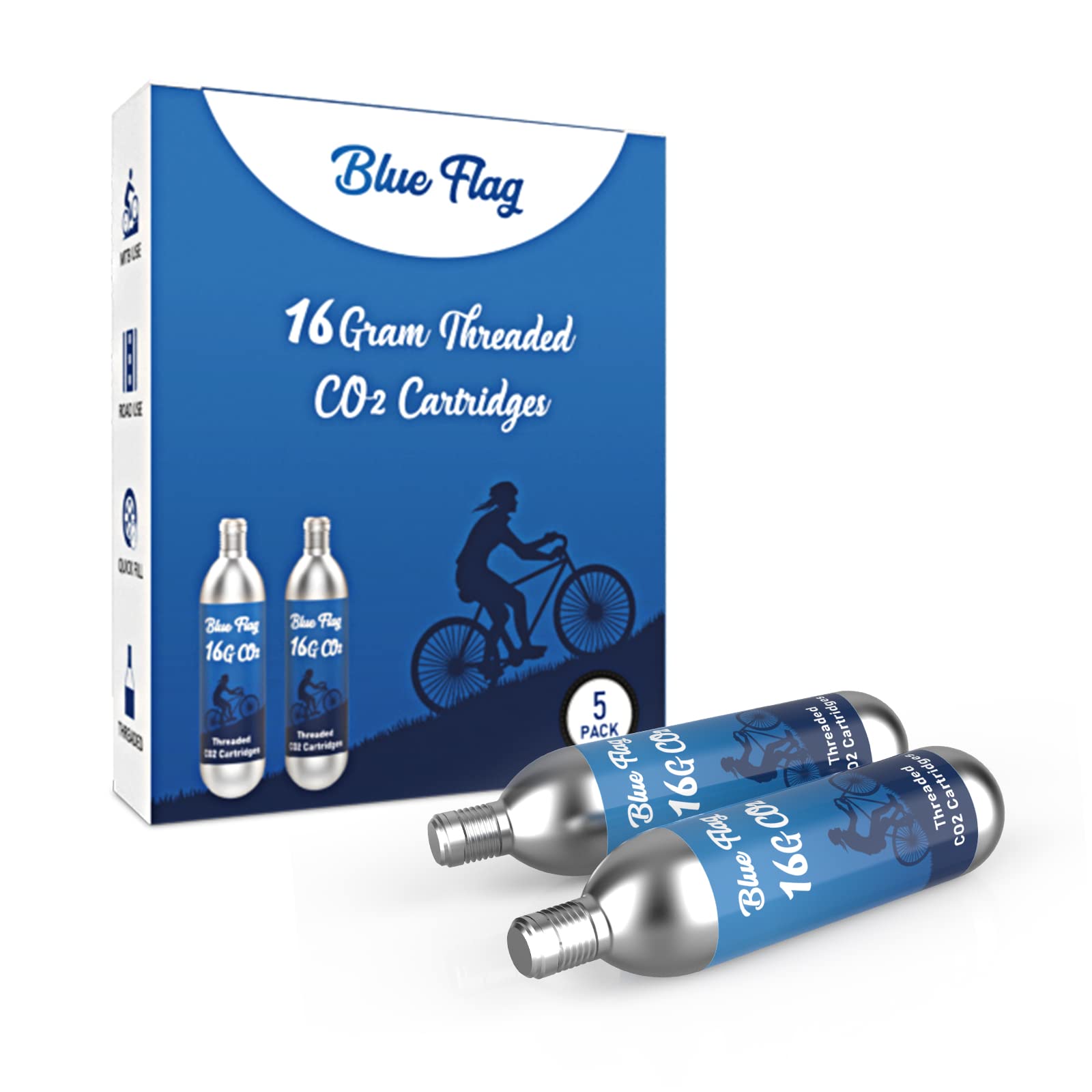BLUE FLAG 16g Threaded CO2 Cartridges for All CO2 Bike Tire Inflators with Threaded Connection Or CO2 Pump- Quick Air Refill for Tires on MTB or Road Bikes, 5 Pack