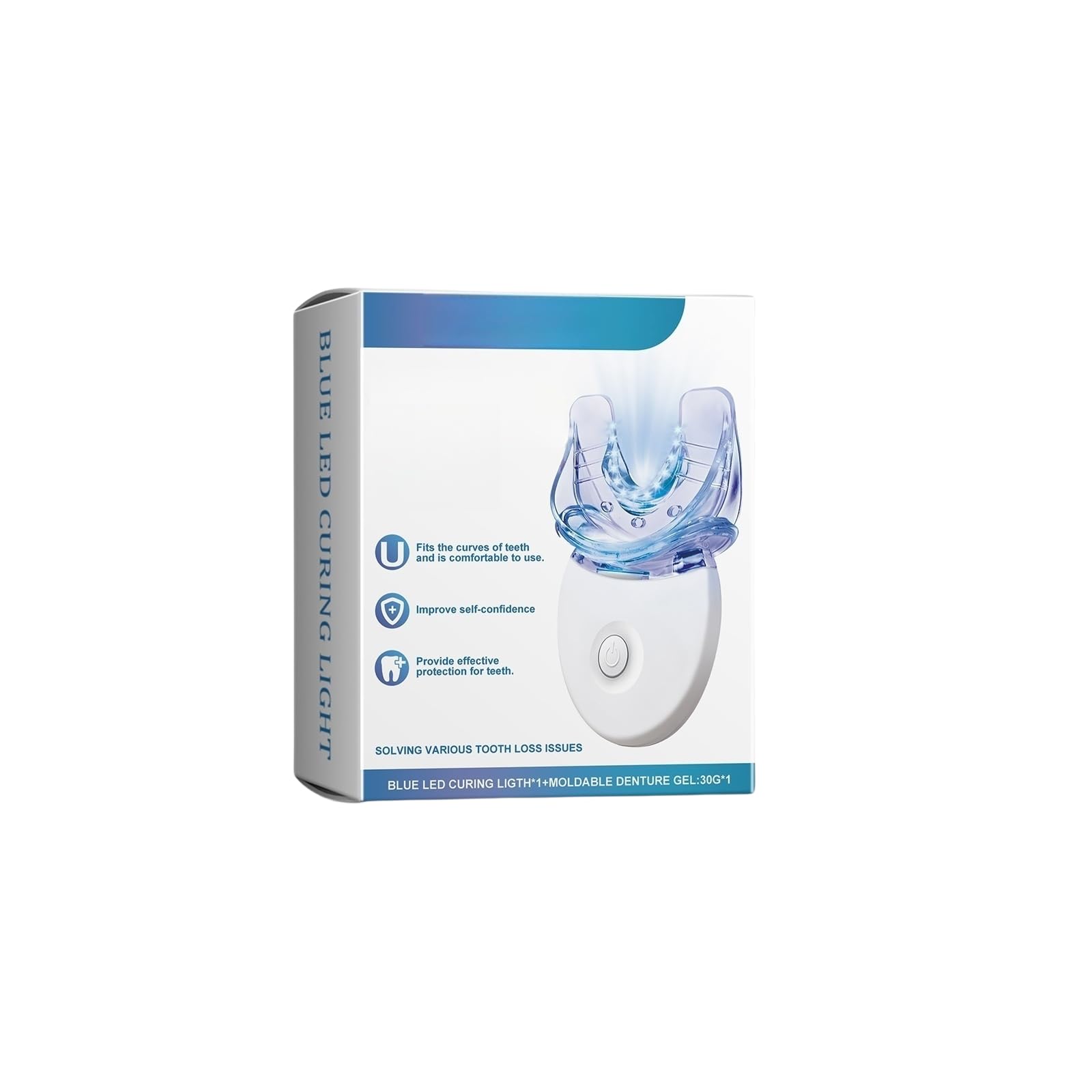 Transform your dental care routine with this innovative Blue LED Dental Curing Light and Moldable Denture Gel kit. The advanced system combines a comfortable U-shaped mouthpiece with professional-grade blue LED technology for effective tooth restoration. The specially formulated gel contains a blend of gutta percha for flexibility, zinc oxide for enhanced adhesion, and barium sulfate for improved stability. This easy-to-use device fits the natural curves of your teeth and provides quick, long-lasting results. The polymer material ensures a high-quality fit, while the blue LED curing technology delivers stable, durable outcomes. The kit includes everything needed for at-home tooth repair: the LED curing light device with one-button operation and the moldable denture gel. Perfect for addressing various tooth restoration needs with professional-quality results. The ergonomic design makes the process simple and comfortable, while the durable construction ensures reliable performance over time.
