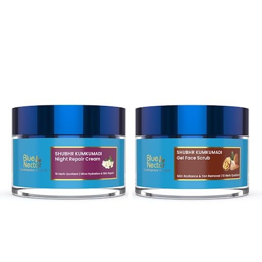 Blue Nectar Kumkumadi Night Cream with Jasmine for Glowing Skin for Women (1.7 Fl Oz) and Walnut Gel Scrub for Deep Exfoliation (1.7 Fl Oz)
