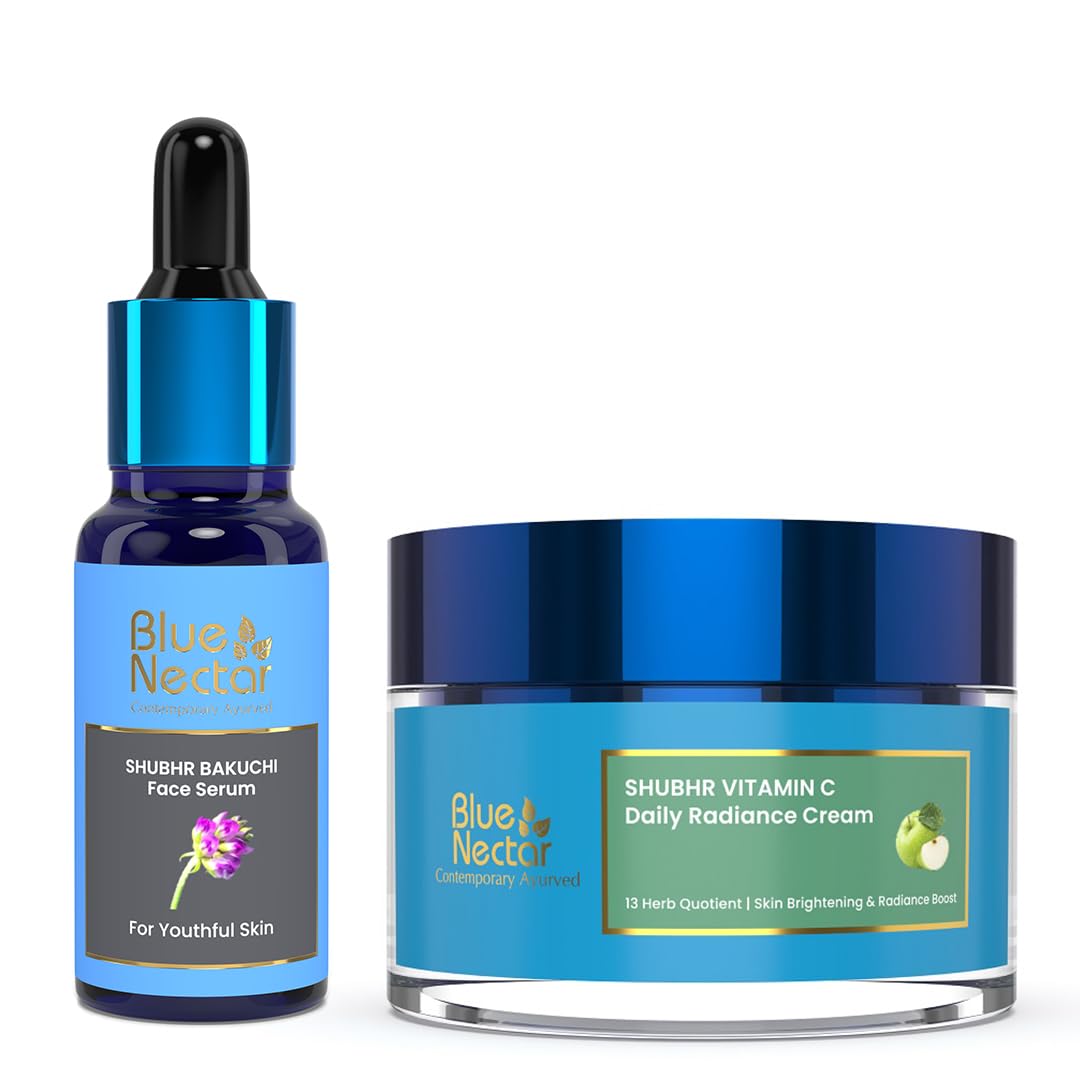 Elevate your skincare routine with our Youthful Skin Bundle! Blue Nectar Bakuchi Anti Aging Serum, a natural alternative to Retinol, targets fine lines and wrinkles, while our Vitamin C Face Cream, enriched with Green Apple and Almond Oil, banishes dark spots. Achieve a glowing complexion today!