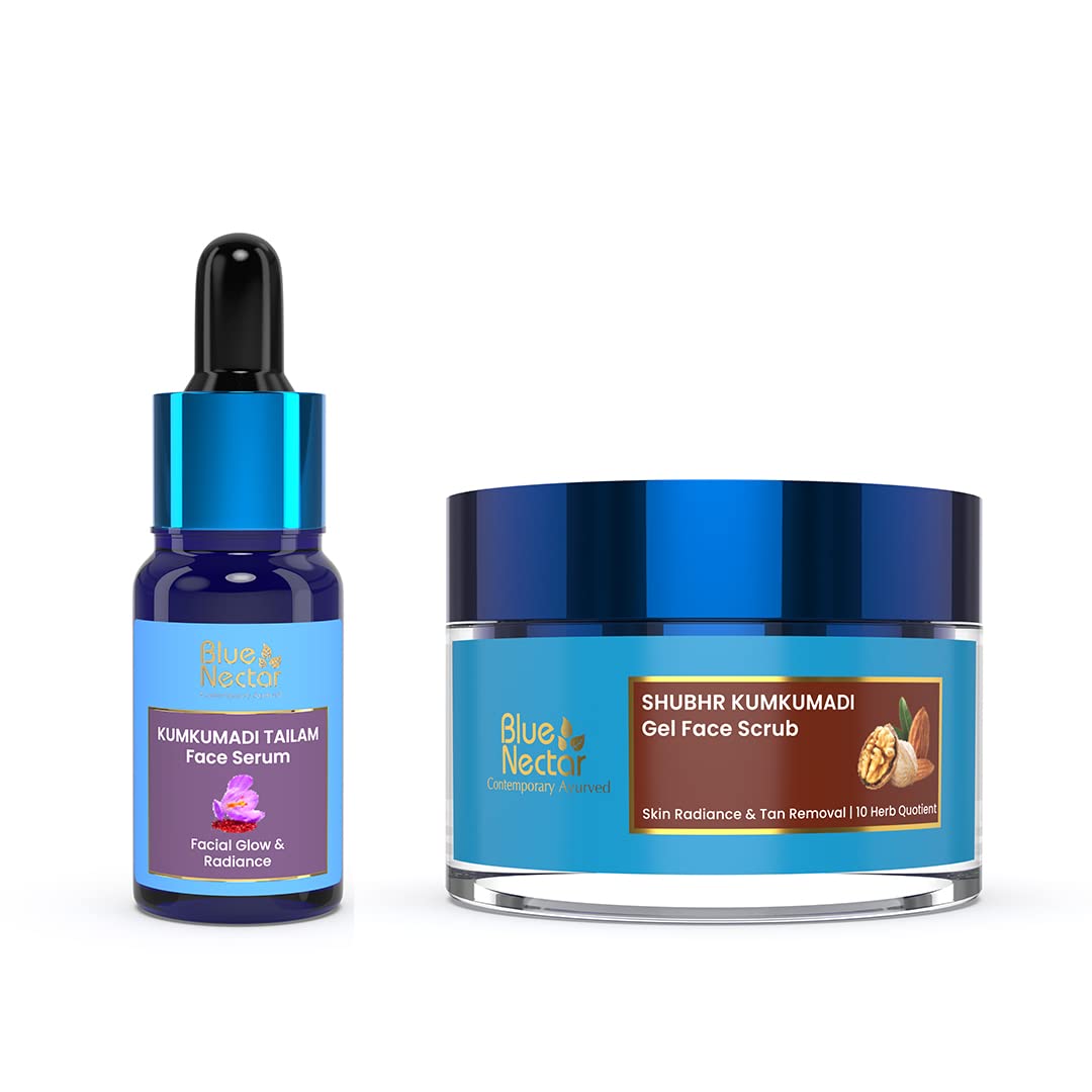 Blue Nectar Kumkumadi Tailam Skin Brightening Face Oil and Walnut Gel Face Scrub combo. The face oil works to illuminate your complexion, while the Walnut Gel Face Scrub gently exfoliates to remove tan and reveal smoother, glowing skin.