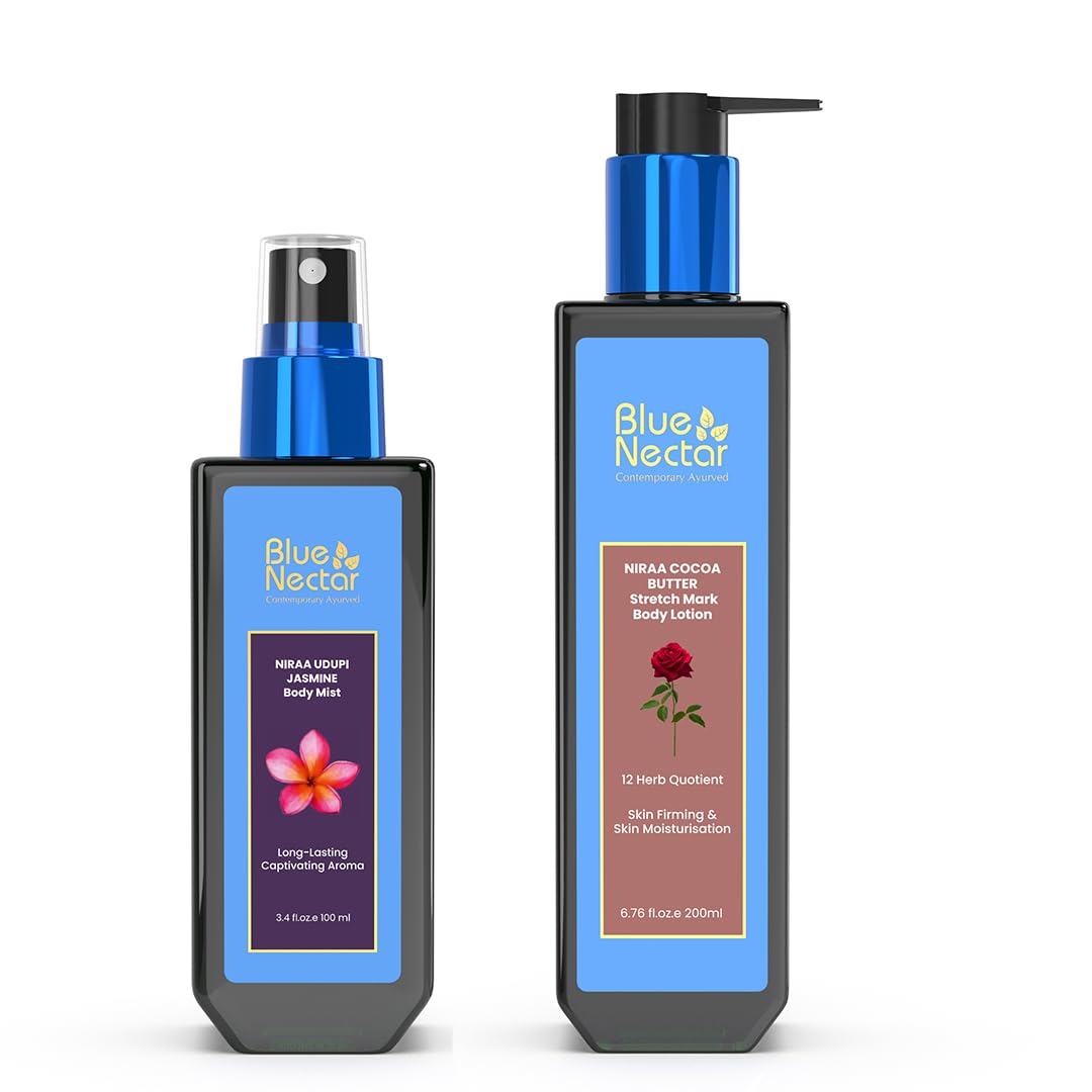 Complete Care: Elevate your self-care routine with this comprehensive bundle. Whether you're an expecting mom or postpartum, indulge in the luxurious combination of skincare essentials that promote well-being, confidence, and a touch of indulgence. Skin-friendly Formulation: Free from harmful chemicals, the stretch mark cream and body mist are gentle on sensitive skin. The unique blend caters to the changing needs of your skin during pregnancy, leaving it supple, hydrated, and delicately scented. Niraa Udupi Jasmine Body Mist: Immerse yourself in the calming aroma of Udupi Jasmine. This body mist, part of the Blue Nectar Niraa range, offers a burst of long-lasting freshness. Spray it on for a revitalizing and relaxing experience. Thoughtful Gifts: Ideal for pregnancy gifts, our bundle combines the goodness of a moisturizing body lotion with the exotic freshness of Niraa Udupi Jasmine Body Mist. Show the moms-to-be in your life that you care with this thoughtful and pampering set. Pregnancy Perfection: Blue Nectar Stretch Mark Cream, a divine blend of Cocoa and Shea Butter, provides intensive moisture and nourishment, helping to prevent and reduce stretch marks. Carefully crafted with 12 Ayurvedic herbs, it's a must-have for moms.