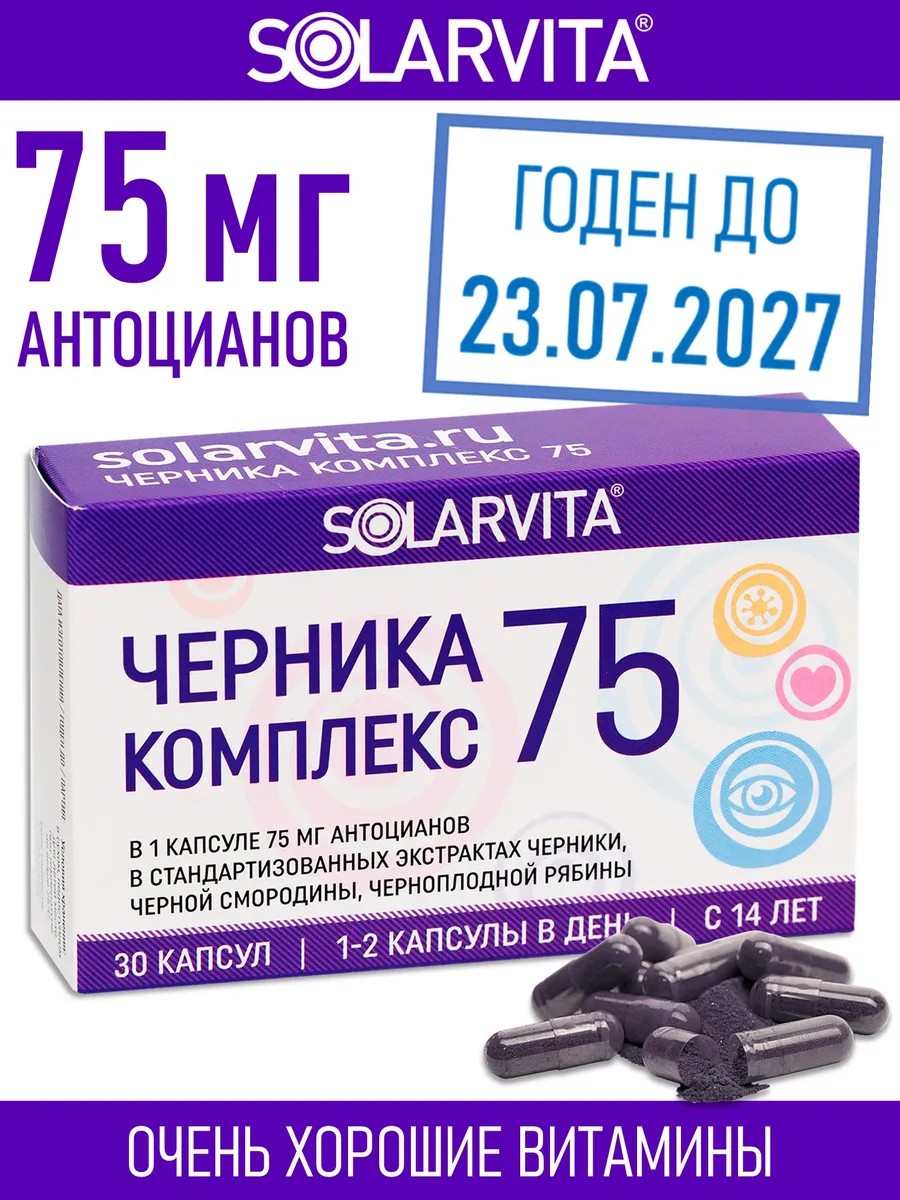 Черника Комплекс 75 Solarvita (Соларвита) – это высокодозный комплекс из стандартизованных экстрактов черники, черной смородины и черноплодной рябины. Содержит повышенное количество активных антоцианов - 75 мг в 1 капсуле.