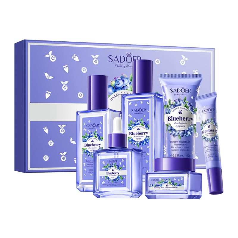 Perfect Gift Set For Women - The blueberry skincare set is ideal for women's daily skincare and is a great choice for anniversaries, Mother's Day, Valentine's Day, Christmas and birthdays! Give it a try, let our pamper skincare gift set bring them beauty and make them more confident!. Suitable For All Skin Types - Suitable for women and men of all skin types, whether oily, dry or even sensitive skin, Whether you want to prevent signs of aging or improve the condition of dry, rough, and dull skin,and you can easily add it to your daily skin care routine,especially during dry winters!. Natural Ingredients - Infused with ingredients like Blueberry, our blueberry facial skin care set deeply nourishes and shields your skin,It enhances skin vitality by reducing dullness and soothing dehydrated skin. Deep Hydration Moisturizing - Blueberry face care kit are hydrating and moisturizing,can penetrate the subcutaneous tissue,while locking in moisture without loss,replenish the skin needs nutrients, can improve the skin. Blueberry Skin Care Set - This comprehensive skin care kit has all your favorite moisturizing necessities: including facial cleanser, toner, face cream, eye cream,serum and lotion,This set can comprehensively moisturize your facial skin!.