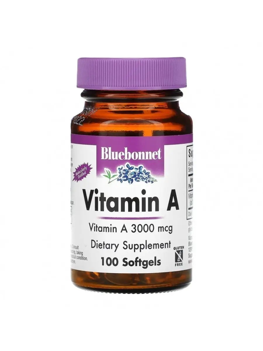 Bluebonnet's Vitamin A 3000 mcg (10,000 IU) capsules contain vitamin A, which promotes healthy vision and a strong immune system. It is extracted from the liver oil of deep-sea, cold-water fish through molecular distillation. Retinol is able to interact with free radicals, including oxygen free radicals. This key property of the vitamin allows it to be considered an effective antioxidant. Retinol also significantly enhances the antioxidant effect of vitamin E. Directions: As a dietary supplement, take 1 capsule daily or as directed by a healthcare professional for a 1-month course. For adults only. Consult a healthcare professional before use if you are pregnant, breastfeeding, taking medication, or have a medical condition. Keep out of reach of children.