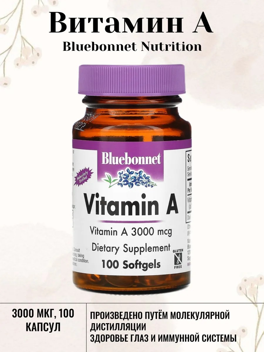 Капсулы витамина А 3000 мкг (10 000 МЕ) от Bluebonnet содержат витамин А, который способствует здоровому зрению и крепкому иммунитету. Его получают из жира печени глубоководных, холодноводных рыб путем молекулярной дистилляции. В качестве пищевой добавки принимать по одной капсуле в день или по назначению лечащего врача. Ингредиенты