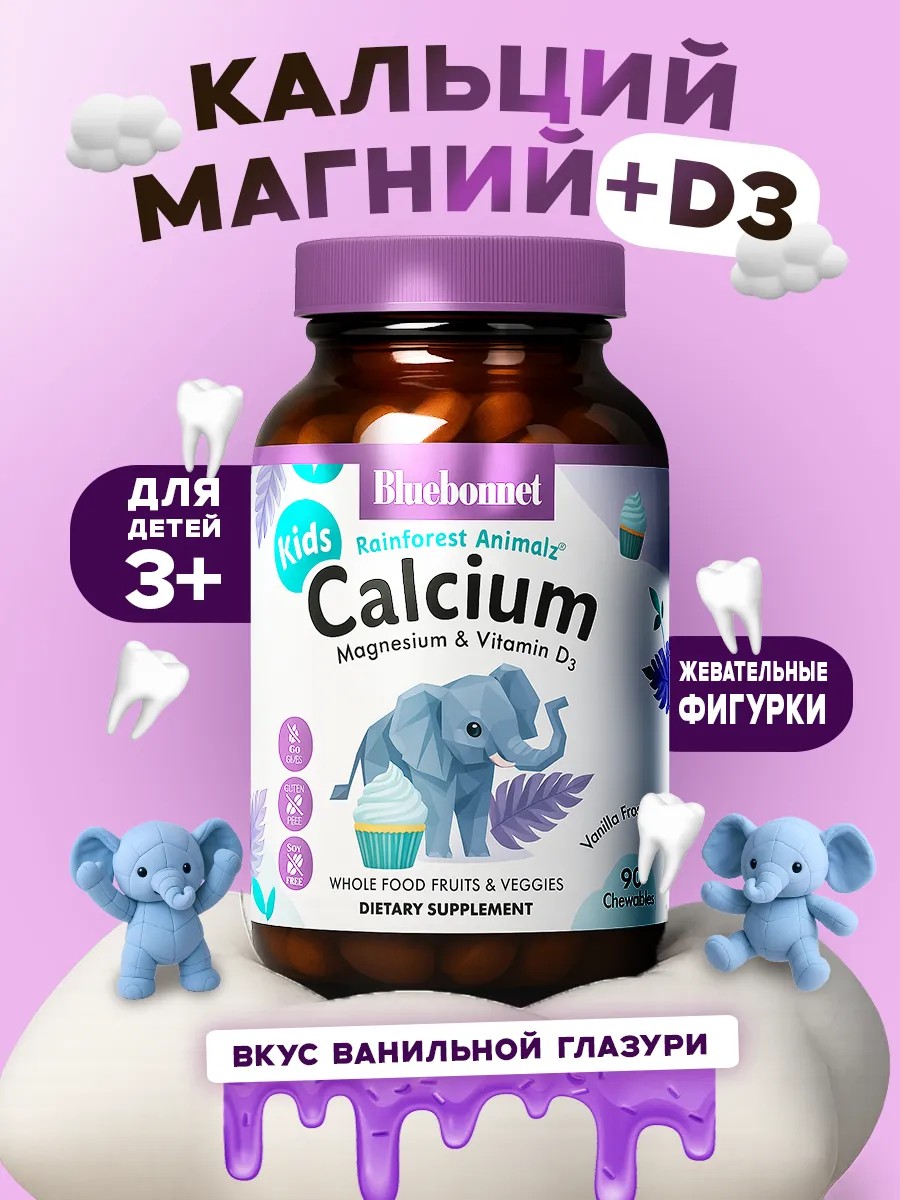 Rainforest Animalz Calcium Magnesium Vitamin D3 from Bluebonnet Nutrition is a chewable dietary supplement with a pleasant vanilla flavor, designed specifically for children.