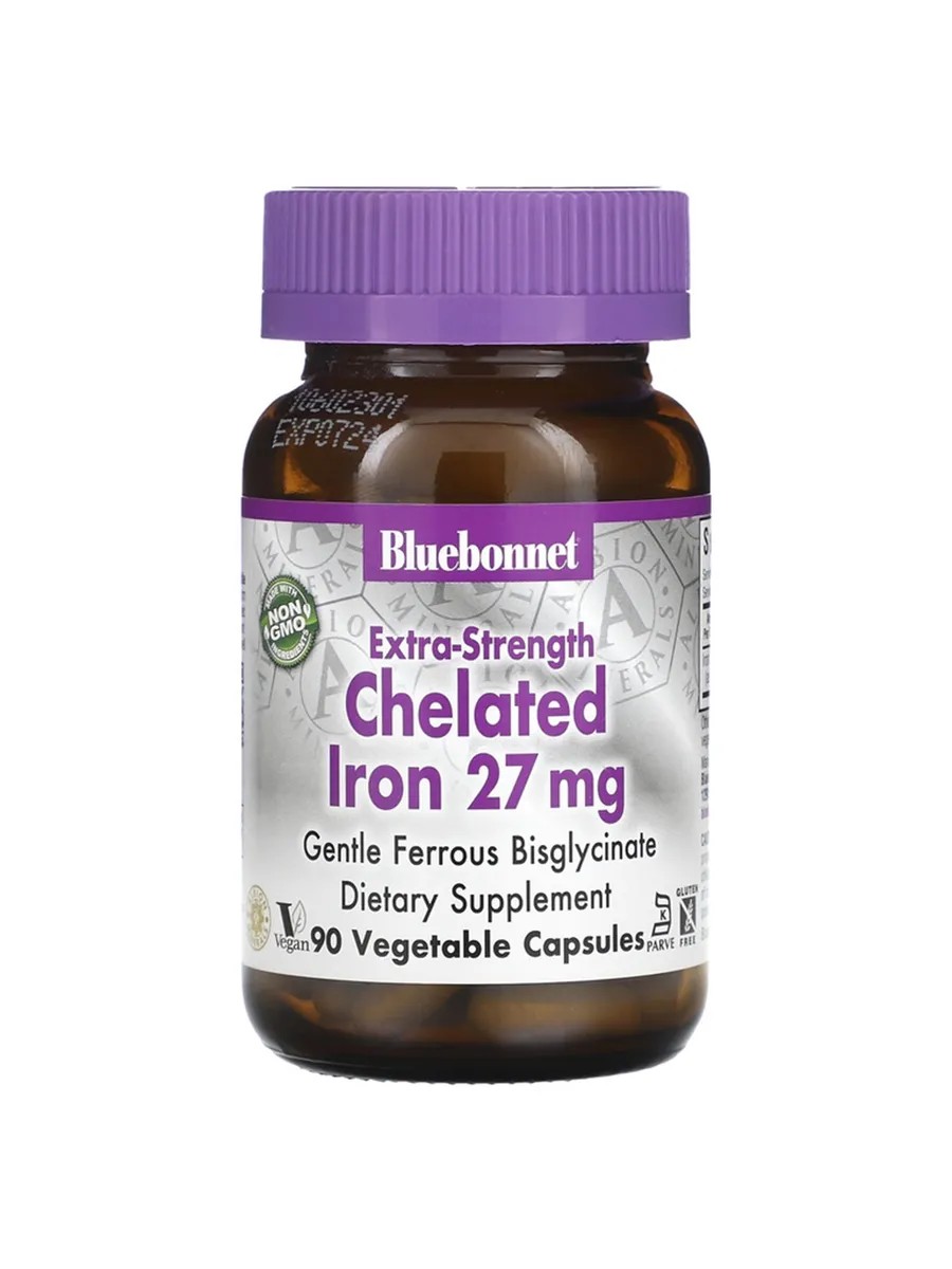 Капсулы Bluebonnet Extra-Strength Chelated Iron 27 мг включают мягкую, не вызывающую запор форму железа, известную как Ferrochel, запатентованный, полностью прореагировавший хелатированный бисглицинат железа от Albion. Выпускается в легко проглатываемой растительной капсуле для максимального усвоения и поглощения.