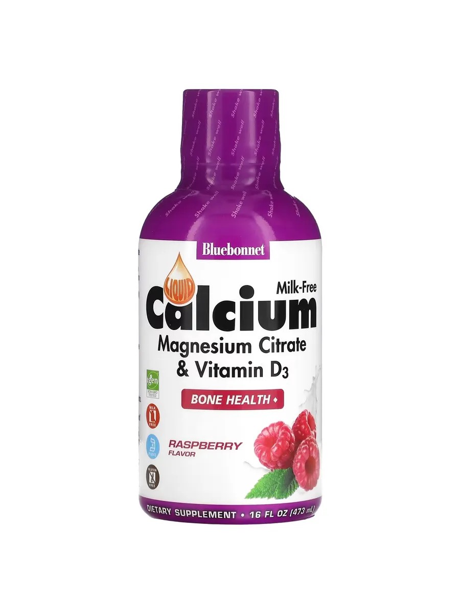 Bluebonnet's Liquid Calcium Magnesium Citrate Plus Vitamin D3 provides calcium in the form of calcium citrate chelate and magnesium in the form of magnesium citrate and magnesium aspartate chelate in natural raspberry flavor.