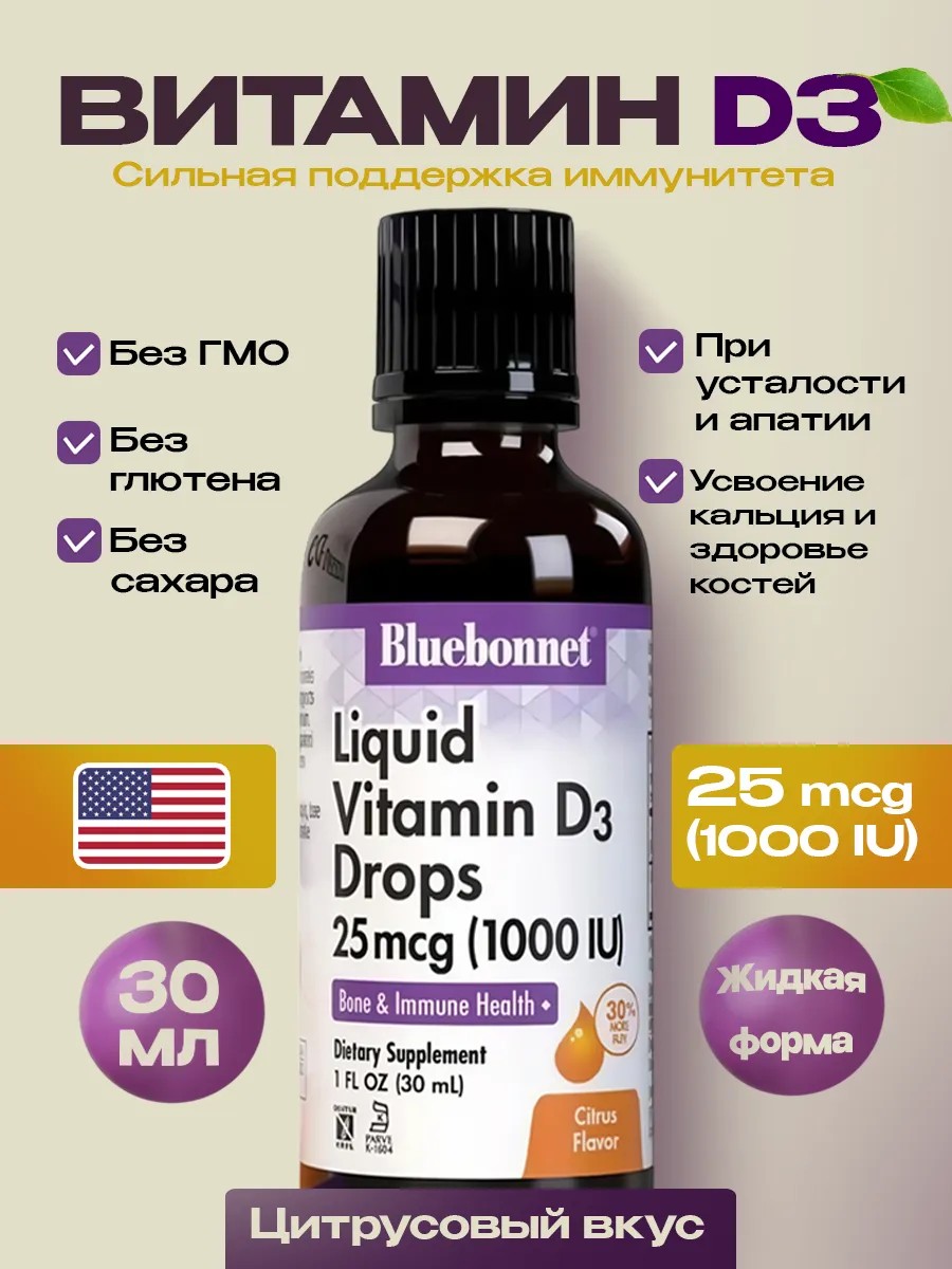 Когда солнца не хватает, на помощь приходит витамин D3. Bluebonnet Nutrition предлагает мощную, высококонцентрированную формулу — 1000 МЕ в одной капле, полученную из натурального ланолина и обогащённую эфирными маслами апельсина и лимона для мягкого цитрусового вкуса.