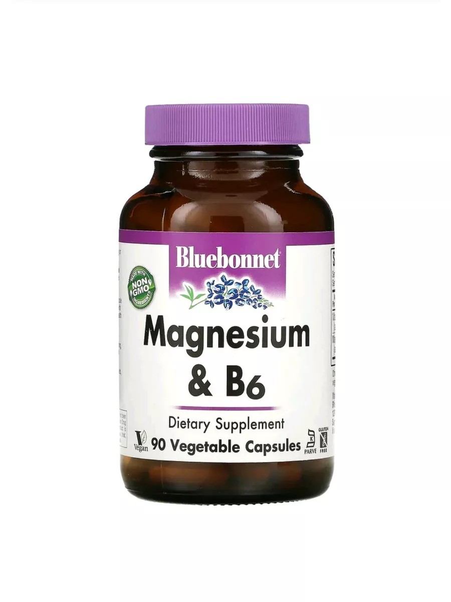 Магний 400 мг и витамин B6 в вегетарианских капсулах от Bluebonnet содержат прореагировавший аспартат магния и оксид магния, а также витамин B6 в виде пиридоксина гидрохлорида. Магний — это минерал, который имеет решающее значение для выработки энергии и обмена веществ, сокращения мышц, передачи нервных импульсов и метаболизма костей, а в сочетании с витамином B6 он может быть полезен для поддержания здоровья сердца и нервов, а также для снятия стресса.