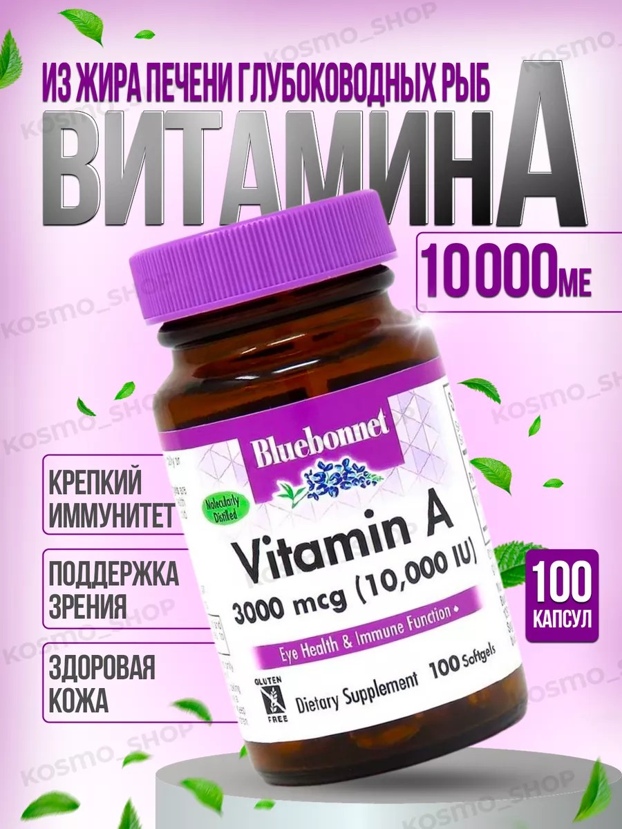 Bluebonnet Nutrition, витамин A, 3000 мкг, 100 капсул. Vitamin A. -:---Произведено путем молекулярной дистилляции---Витамин A (3000 мкг)---Пищевая добавка---Без глютена---Капсулы витамина А 3000 мкг (10 000 МЕ) от Bluebonnet содержат витамин А, который способствует здоровому зрению и крепкому иммунитету. Его получают из жира печени глубоководных, холодноводных рыб путем молекулярной дистилляции.---Рекомендации по применению---В качестве пищевой добавки принимать по одной капсуле в день или по назначению лечащего врача.---Ингредиенты---Желатин (бычий), глицерин, очищенная вода, соевое масло.---Содержит рыбу (треска), сою.---Не содержит молока, яиц, моллюсков и ракообразных, древесных орехов, арахиса и пшеницы.---Также не содержит кукурузы, дрожжей, глютена, ячменя, риса, натрия и сахара.---Предупреждения---Только для взрослых. Перед приемом во время беременности, грудного вскармливания, в случае приема лекарств или наличия заболеваний проконсультируйтесь с врачом. Хранить в недоступном для детей месте.