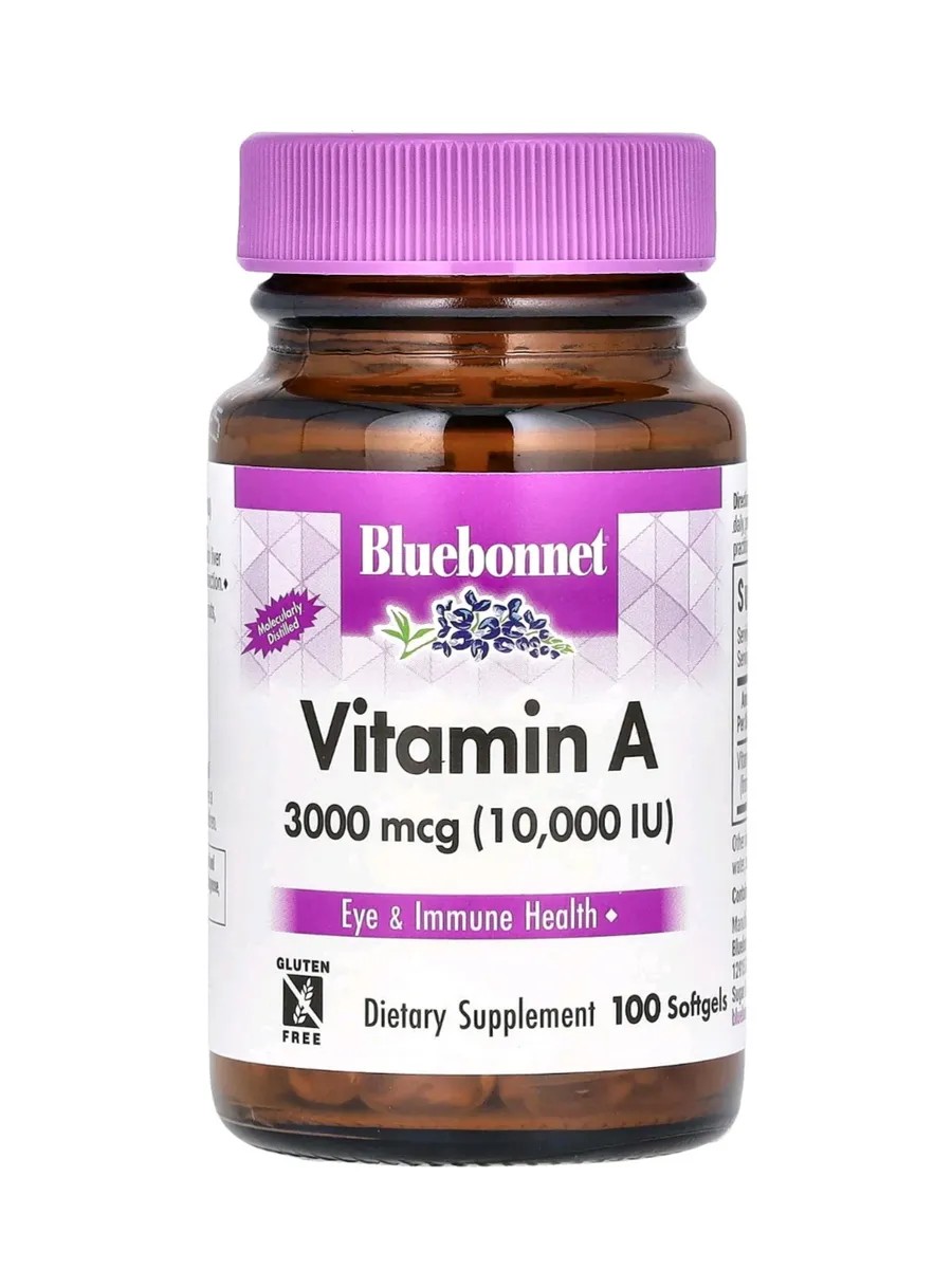 Bluebonnet's Vitamin A 3,000 mcg (10,000 IU) Capsules provide vitamin A from molecularly distilled deep, cold-water fish liver oil to help support eye health and immune function.