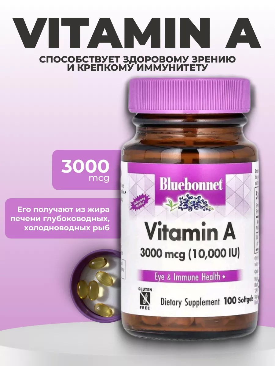 Капсулы витамина А 3000 мкг (10 000 МЕ) от Bluebonnet содержат витамин А, который способствует здоровому зрению и крепкому иммунитету. Его получают из жира печени глубоководных, холодноводных рыб путем молекулярной дистилляции.