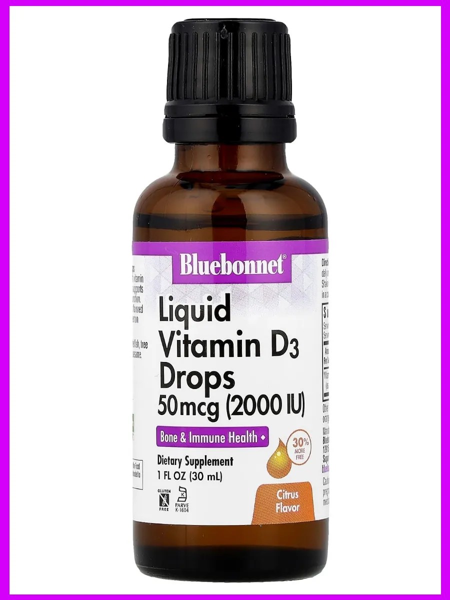 Жидкий витамин D3 в каплях от Bluebonnet в концентрации 2000 МЕ содержит натуральный витамин D3 (холекальциферол) получаемый из ланолина. Каждая капля этого «солнечного» витамина ароматизирована небольшим количеством эфирных масел апельсина и лимона. Поставляется в виде жидких капель для максимального усвоения и лучшего впитывания.