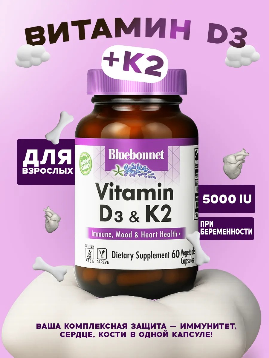 Bluebonnet D3 + K2 — удобное сочетание двух витаминов для комплексной поддержки здоровья в растительной форме без лишних добавок.