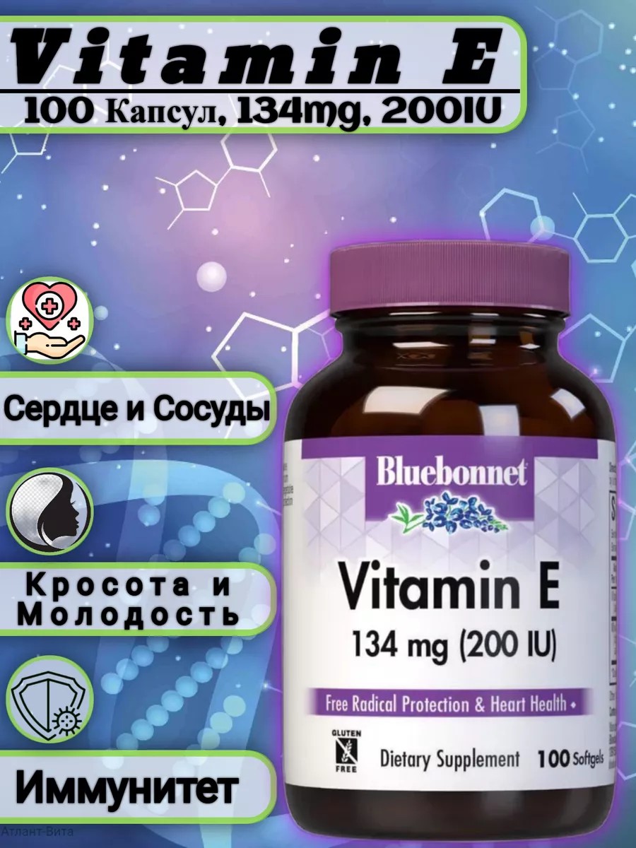 | Package | 100 capsules; 134 mg; 200 IU; Vitamin E; dietary supplements; circulatory system; vascular elasticity; prevention of blood clots; for the reproductive system; rejuvenates and strengthens; antioxidant properties; Improving brain activity |