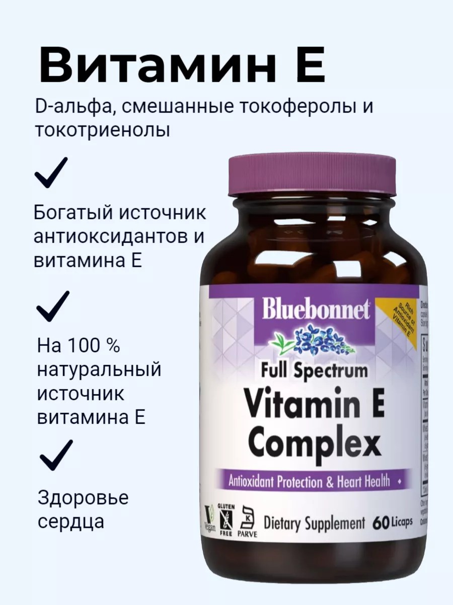 Ликапы полного спектра витамина Е от Bluebonnet специально созданы с использованием d-альфа-токоферола и изомеров токоферола полного спектра (альфа, бета, дельта и гамма) и изомеров токотриенола (альфа, бета, дельта и гамма) из экологически чистых негидрогенизированных пальмовых источников. масло из Малайзии, которое требует соблюдения строгих экологических норм. Исследования показали, что комплекс витаминов Е, содержащий всех членов семьи, может принести больше пользы для здоровья, чем просто d-альфа-токоферол. Продукт выпускается в виде капсул растительного происхождения, наполненных жидкостью, которые легко глотать, для получения по-настоящему вегетарианской формулы.