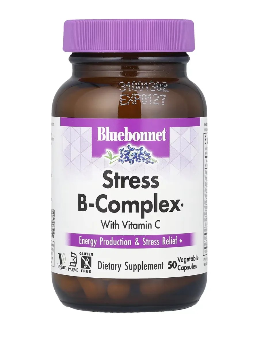 Растительные капсулы Stress B-Complex для спортивного питания от Bluebonnet содержат полный спектр витаминов группы В, а также витамин С из L-аскорбиновой кислоты, которые играют дополнительную роль в поддержании физиологических и метаболических функций, поддерживающих выработку энергии и здоровье нервной системы.. Stress B-Complex от Bluebonnet Nutrition – это полный комплекс витаминов группы B в повышенных дозировках для спортсменов. Добавка предназначена для быстрого устранения дефицита и негативных проявлений недостатка витаминов группы B. Вещества из B-группы играют важнейшую роль в поддержании здоровья ЦНС, метаболических процессов, кожи и других биохимических реакций. Комплекс нормализует работу ЦНС, применяется для лечения и профилактики депрессии и различных психических расстройств. Также добавка улучшает память, когнитивные функции и работу мозга.. Витамины группы B участвуют в белковом, жировом и углеводном обмене, регулируют уровень энергии. Микроэлементы необходимы для выработки многих важных ферментов, гормонов и других соединений. Добавка особенно популярна в спорте, витамины группы B не только снижают влияние стресса на ЦНС и приводят к более быстрому восстановлению, но и повышают физическую продуктивность.