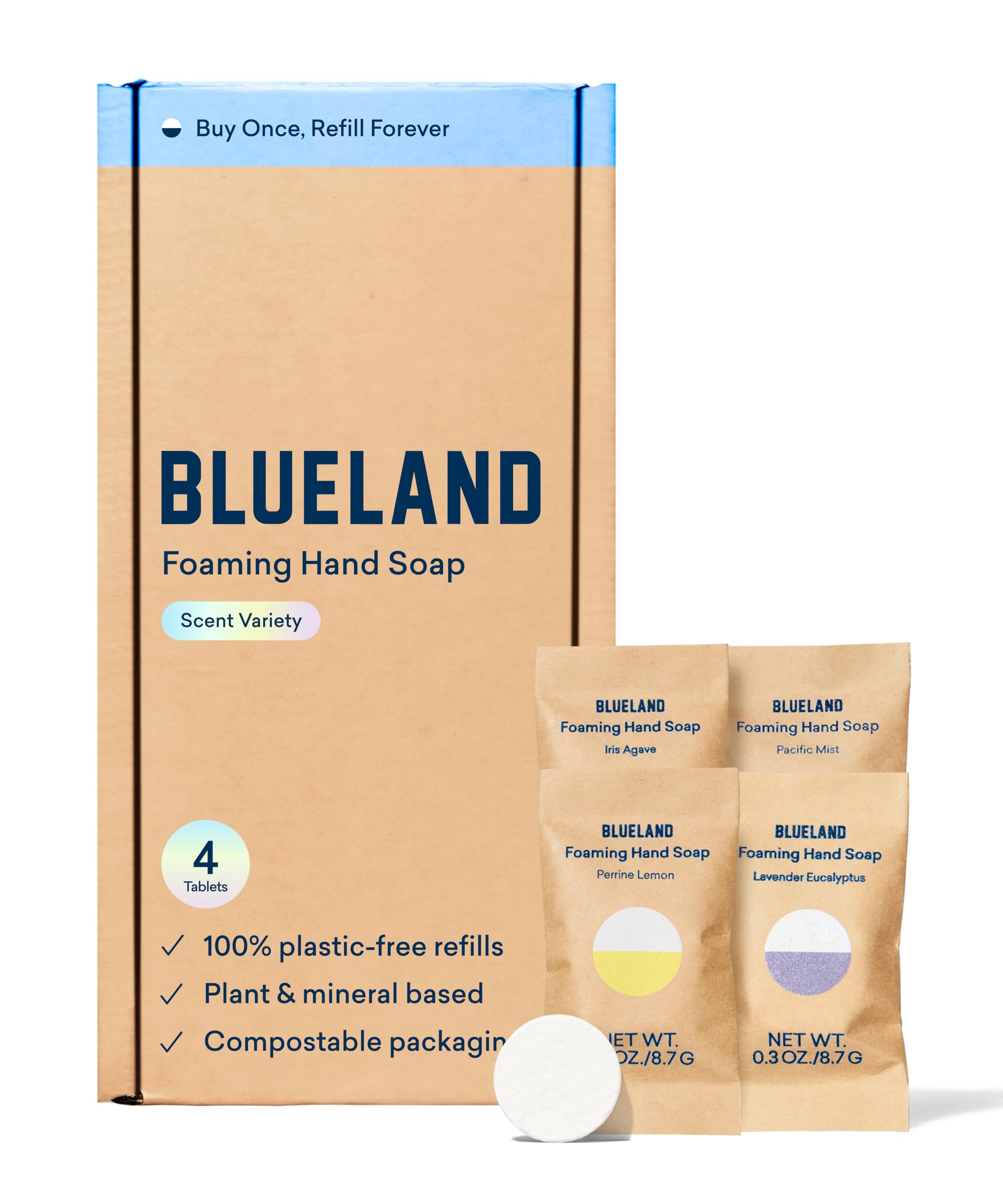 Questions or concerns about your purchase? Contact our Blueland Customer Experience Team and we'll help make it right!. FRESH SCENTS. Classic scent variety includes Iris Agave, Perrine Lemon, Lavender Eucalyptus, and Pacific Mist. SAFE FOR KIDS. Hypoallergenic, EPA Safer Choice Certified, Leaping Bunny Certified, Cruelty-Free, Vegan, B Corp Certified, and Climate Neutral. CLEAN INGREDIENTS. Microplastic-free formula made with plant and mineral-based cleaning power so it's safe for everyone in the family. HOW IT WORKS. Fill your bottle with water to the half-round symbol or line, and drop in a tablet. Allow the tablet to fully dissolve to make 9oz of rich Foaming Hand Soap. REFILLABLE, ECO-FRIENDLY FOAMING HAND SOAP. One bottle, refill it forever. Just fill your reusable glass Forever Bottle with water, drop in a 100 plastic-free tablet and and enjoy rich, foaming goodness at your fingertips! Consider it your sink's BFF (literally forever).