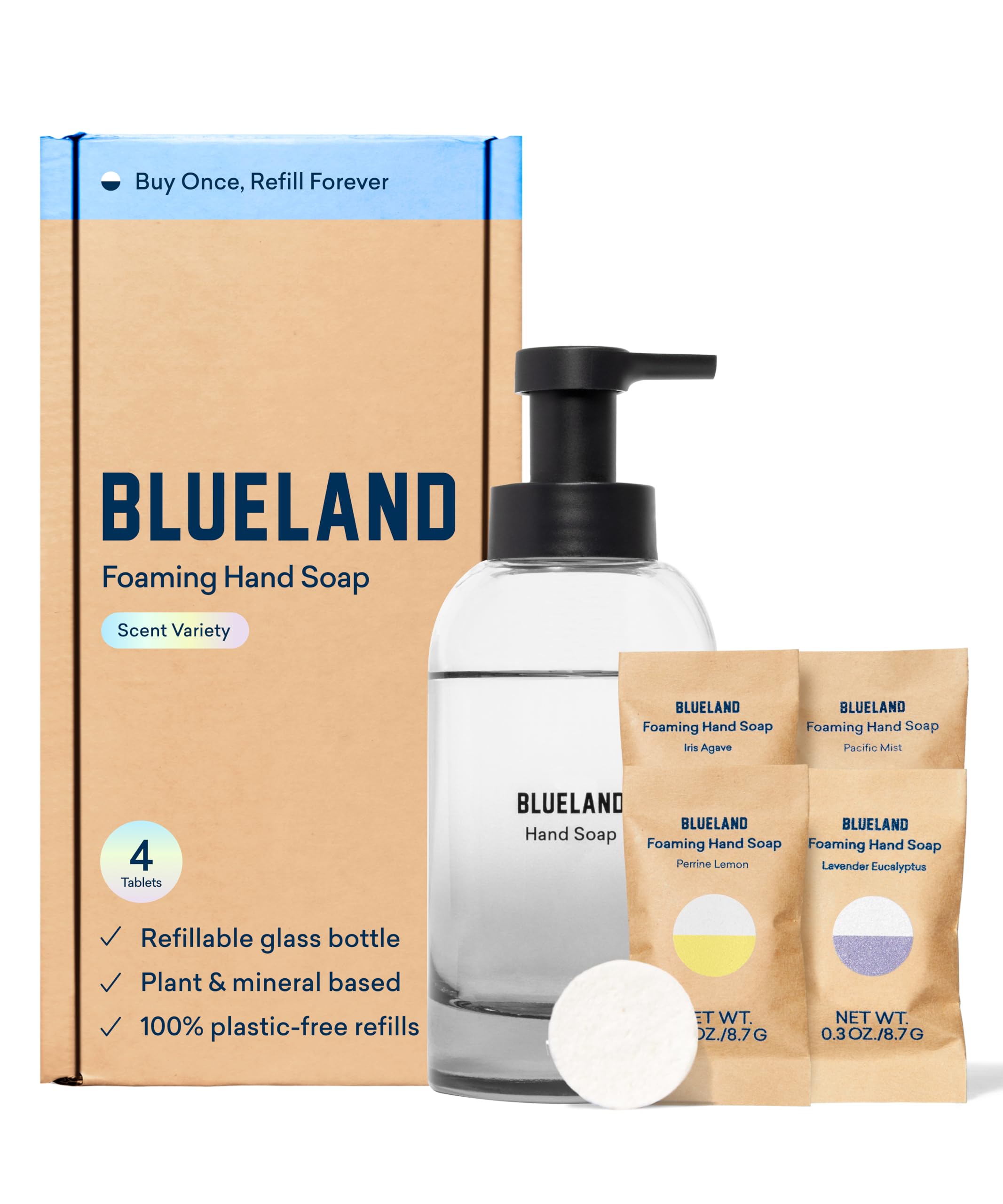 Questions or concerns about your purchase? Contact our Blueland Customer Experience Team and we'll help make it right!. FRESH SCENTS. Classic scent variety includes Iris Agave, Perrine Lemon, Lavender Eucalyptus, and Pacific Mist. SAFE FOR KIDS. Hypoallergenic, EPA Safer Choice Certified, Leaping Bunny Certified, Cruelty-Free, Vegan, B Corp Certified, and Climate Neutral. CLEAN INGREDIENTS. Microplastic-free formula made with plant and mineral-based cleaning power so it's safe for everyone in the family. HOW IT WORKS. Fill your bottle with water to the half-round symbol or line, and drop in a tablet. Allow the tablet to fully dissolve to make 9oz of rich Foaming Hand Soap. REFILLABLE, ECO-FRIENDLY FOAMING HAND SOAP. One bottle, refill it forever. Just fill your reusable glass Forever Bottle with water, drop in a 100 plastic-free tablet and and enjoy rich, foaming goodness at your fingertips! Consider it your sink's BFF (literally forever). Each tablet makes one full bottle of Foaming Hand Soap.