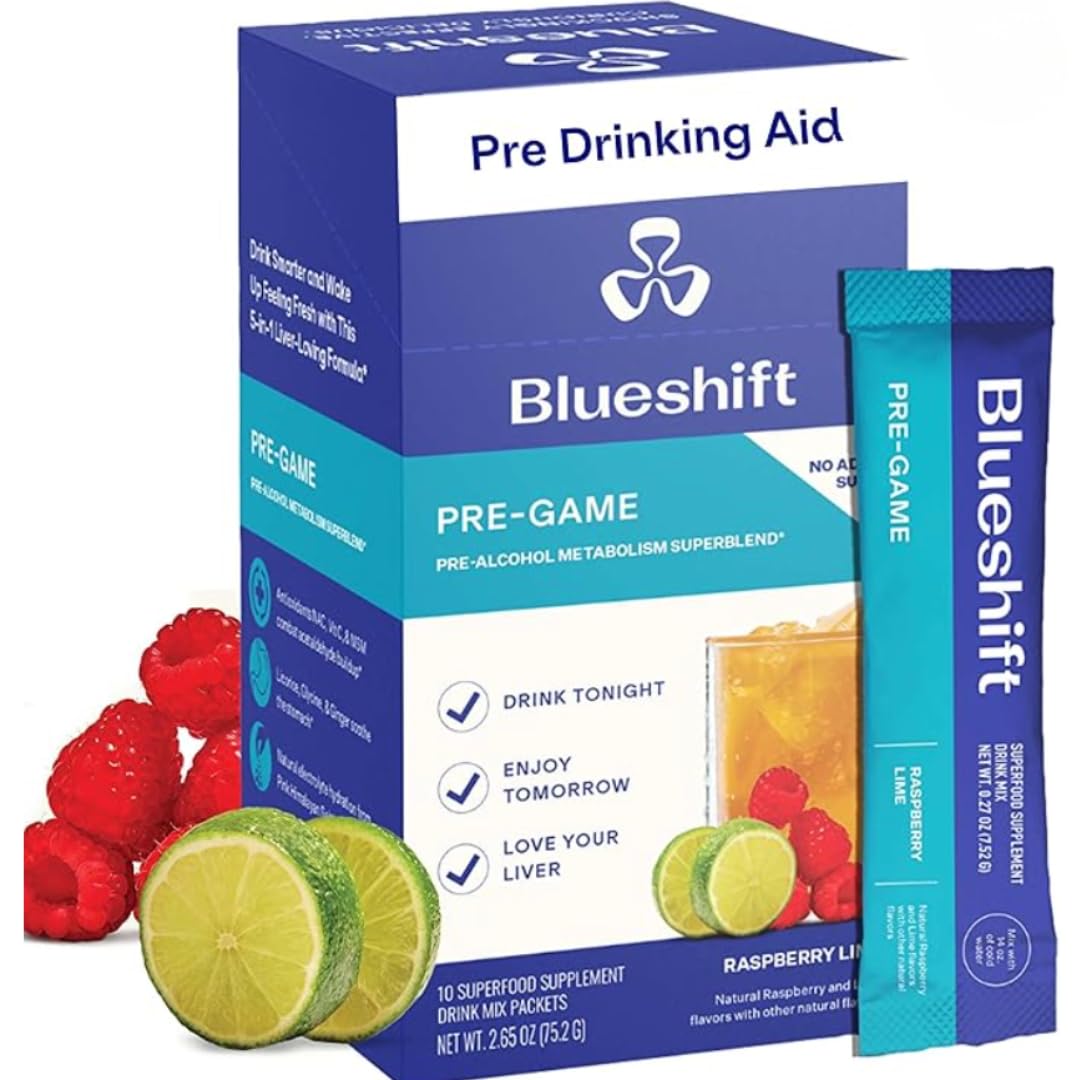Blueshift Pre-Game is a 4-in-1 pre-drinking supplement designed to support hydration, liver function, digestion, and overall wellness with clean, purposeful ingredients. Each convenient, single-serve stick pack contains N-Acetyl Cysteine (NAC), a well-studied antioxidant that helps the body process adult beverages, along with Milk Thistle, Silymarin, and Prickly Pear Leaf to support your liver's natural detoxification pathways. To promote hydration without added sugar, Pre-Game includes Himalayan Pink Salt and essential minerals for a clean source of electrolytes. Ginger Root, Deglycyrrhizinated Licorice Root, and Taurine help soothe the stomach and support digestive comfort, making this formula ideal for social events, travel, or evening routines. Each refreshing raspberry lime packet mixes with 14 oz of water for fast, flavorful support. Vegan, gluten free, keto friendly, and made without artificial flavors or preservatives, Blueshift Pre-Game is your smarter way to prep—so you can enjoy the night and show up feeling your best the next day.GREAT FOR ALL OCCASIONS: From dinner out with friends to an all-day-and-night bachelor party, these on-the-go powder packets are perfect for all your celebrations. Travel and TSA-friendly. NO SUGAR: Our raspberry lime drink mix is naturally and subtly sweet and has absolutely no sugar. Mix with 14oz of water and stir regularly. POWERFUL ANTIOXIDANT AND LIVER SUPPORT: These hydration packets contain NAC, milk thistle, prickly pear, and deglycerized licorice to support both next-day and long-term liver health. GET AHEAD OF IT HYDRATE: These Superblend powder packets contain NAC to help support the natural removal of toxins and Himalayan pink salt for natural electrolytes so you can feel better tomorrow. FEEL BETTER THE DAY AFTER: Blueshift Pre-Game is a powerful 4-in-1 supplement with NAC to help combat acetaldehyde buildup, electrolytes for hydration, milk thistle for liver support, and ginger and deglycerized licorice to help soothe your stomach.