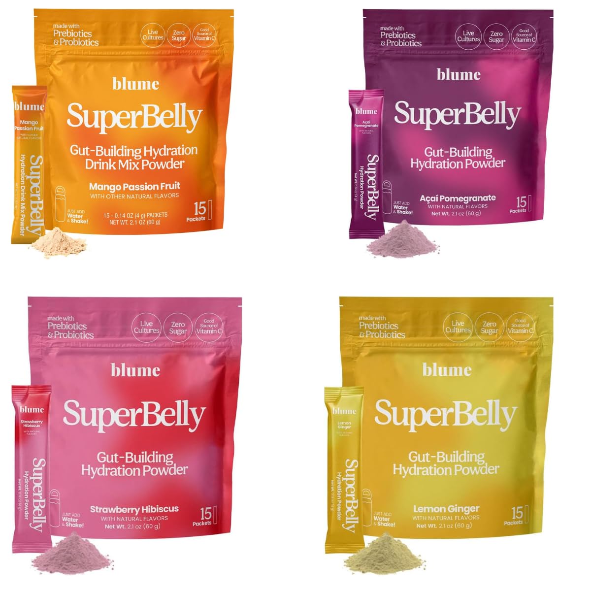 Blume SuperBelly Gut Health and On-The-Go Hydration Packets GLP-1 Friendly Sugar-Free with Prebiotics Probiotics Apple Cider Vinegar Vitamin C and Electrolytes Strawberry Lemon Mango Acai 60 Sticks