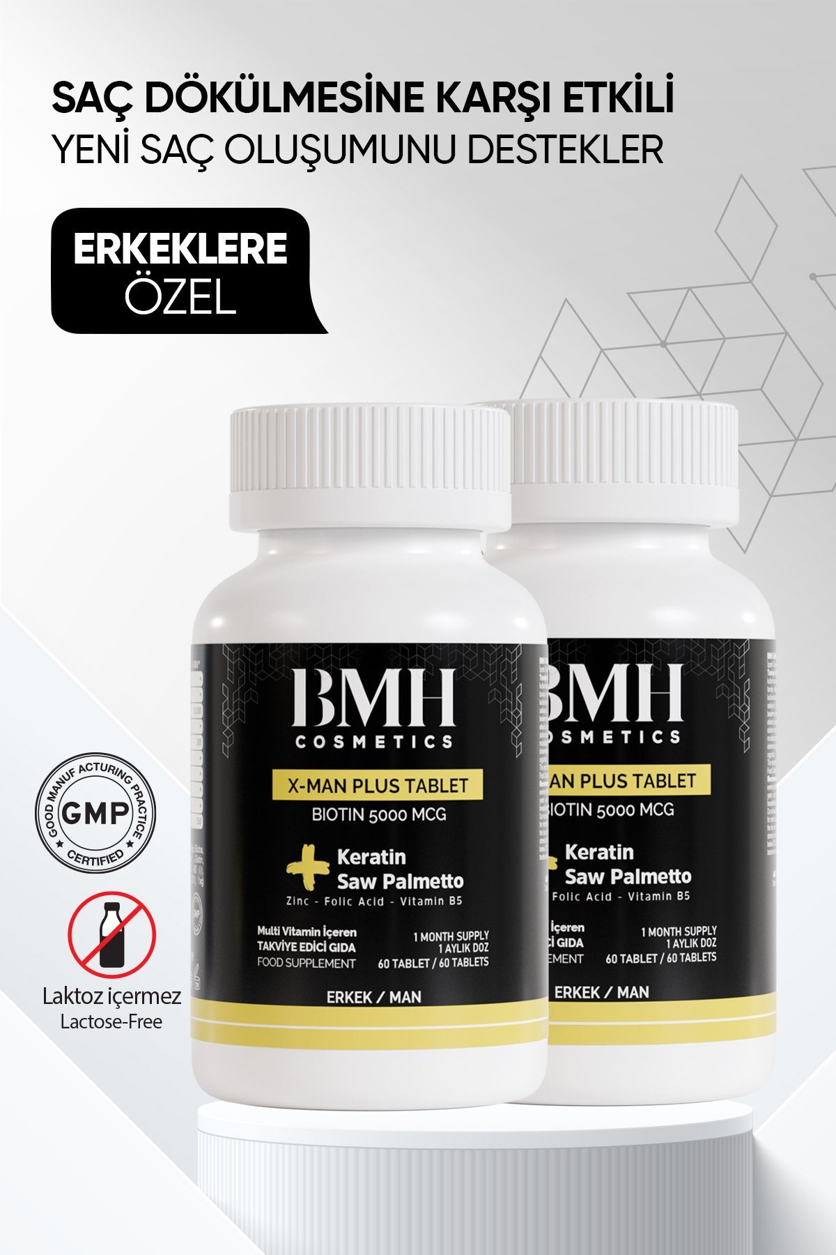 BMH X-Man Plus Tablet, keratin ve Saw Palmento, Zinc, Folic acid ve Vitamin B5 içermektedir. 1 Kutu Içerisinde 60 tablet bulunmaktadir. Erkeklere özel hazirlanmis olan multi vitamin içeren takviye edici gidadir.