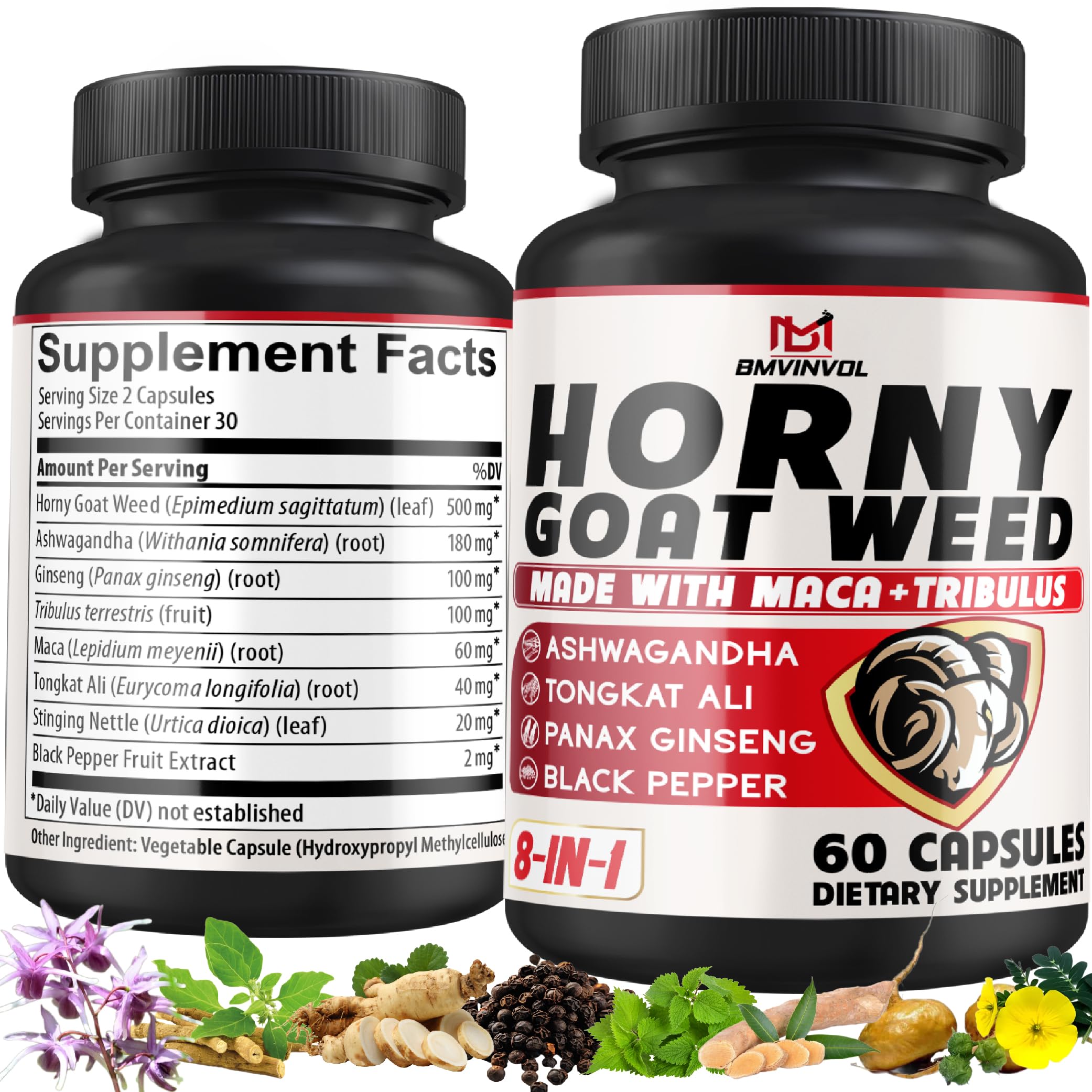 BMVINVOL Horny Goat Weed Capsules with Panax Ginseng Tribulus Ashwagandha Maca Tongkat Ali Nettle Black Pepper - 60 Capsules