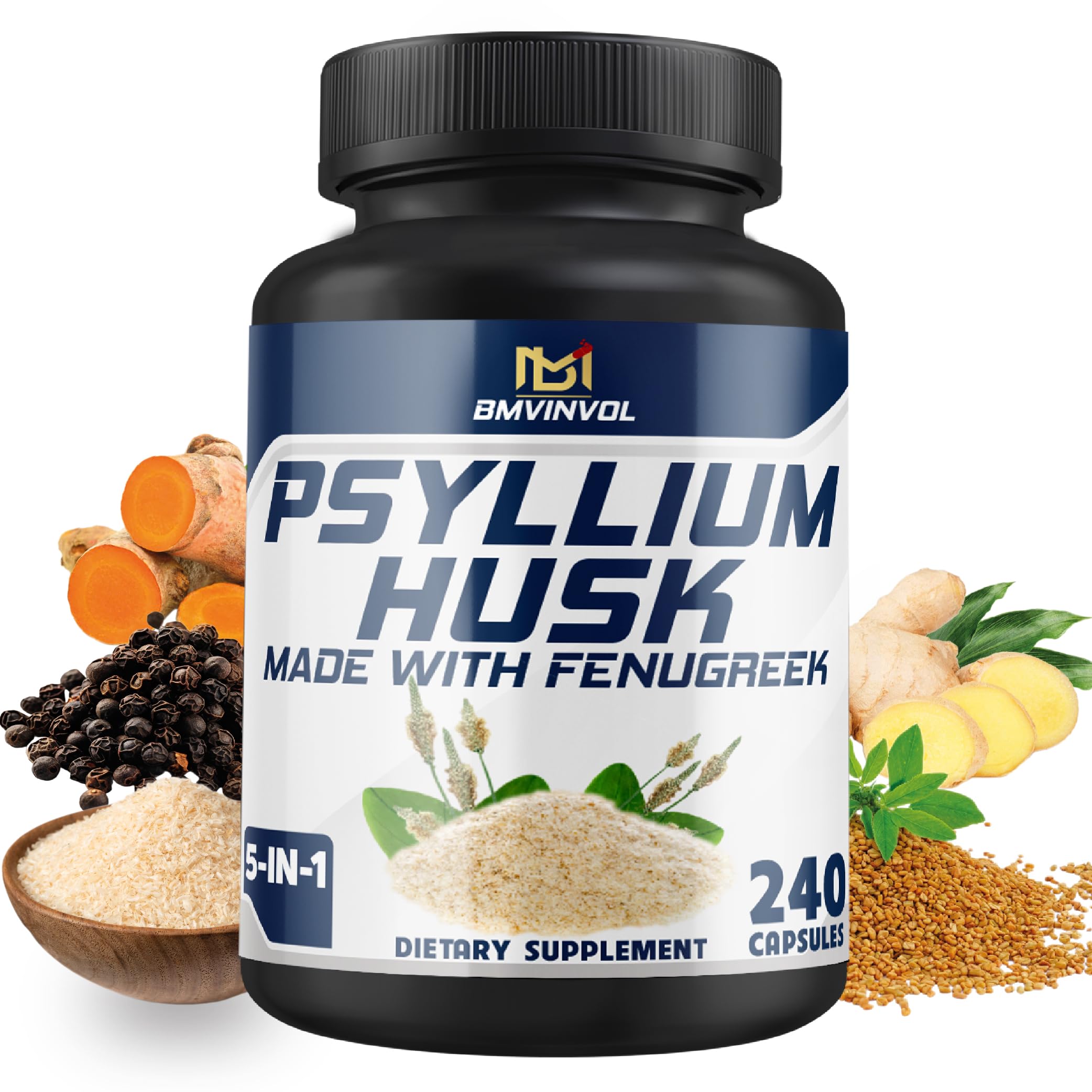 BMVINVOL Psyllium Husk Capsules Fiber Supplement with Fenugreek Turmeric Ginger Black Pepper - Support Digestive System Intestinal Health - 240 Count for 4 Month Supply