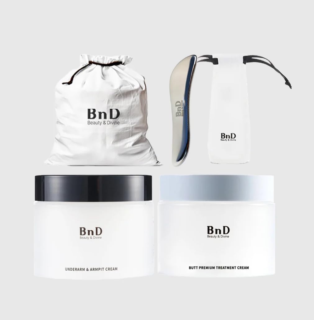 A special set featuring the perfect BnD cream for Y-zone, underarms, and hips care, now with the added bonus of a Gua Sha and spatula!