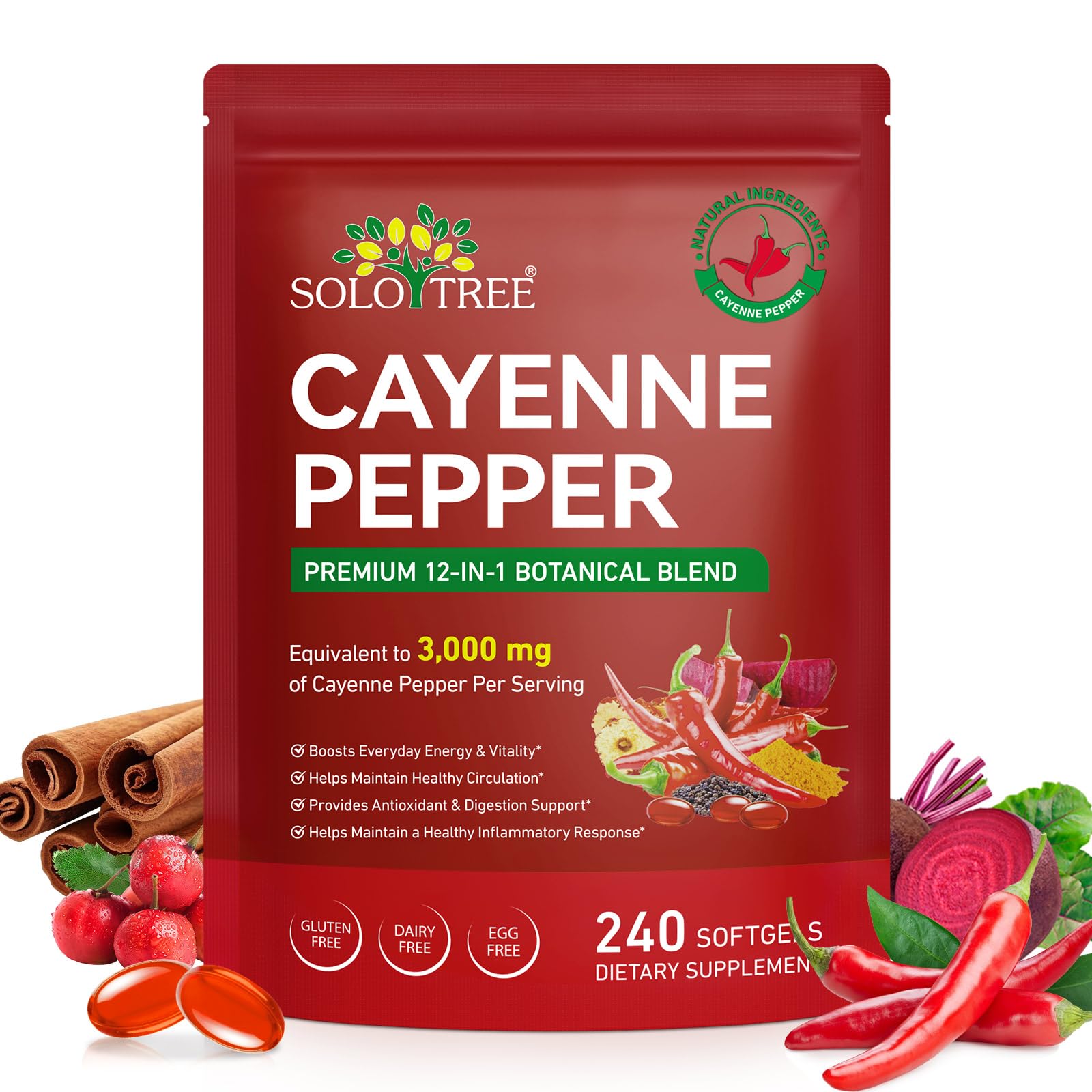 80-DAY SUPPLY, 240 EASY-TO-SWALLOW CAPSULES These softgels are carefully made without gluten, dairy, or major nuts, offering a clean and gentle choice for sensitive needs.Designed for daily use, this convenient formula fits seamlessly into your routine, helping you stay consistent with your wellness goals. GENTLE DIGESTIVE AID Cayenne Pepper has been used for generations to promote comfortable digestion. Our formula supports gut balance and helps ease occasional digestive discomfort, making it easier to maintain daily digestive wellness. FORTIFIED IMMUNE NUTRIENT DEFENSE SUPPORT Fortified with Vitamins D3 and E, our softgels help strengthen your body's natural defenses. The added antioxidant properties from Grape Seed and Turmeric extracts help protect cells from oxidative stress, supporting long-term wellness. SOFTGELS WITH CAYENNE PEPPER 12-IN-1 Cayenne Pepper Softgels Supplement features a 12-in-1 plant-based blend including Turmeric, Hawthorn Berry, Grape Seed Extract, Beet Root, and Vitamin D3 K2 Vitamin E to support digestive health and helps maintain energy levels and overall vitality as part of a healthy lifestyle. 3000MG POTENT DAILY FORMULA Each serving delivers a powerful 3,000 mg equivalent of Cayenne Pepper, traditionally used to help support healthy metabolism and promote circulation.These Cayenne Pepper Liquid Drops support improved circulation and metabolism while delivering essential vitamins K2 and D3 for optimal wellness.