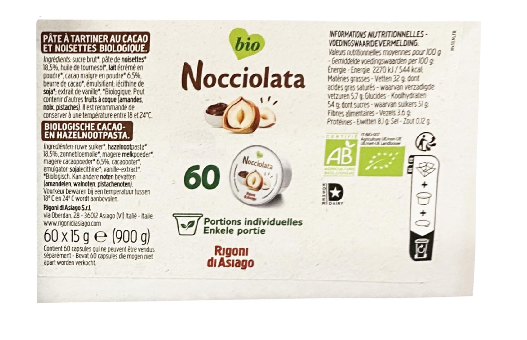 Nocciolata is a creamy and delicious organic spread, rich in hazelnuts (18.5 ) and without palm oil. Presented in a portion pad (15 g) compostable, practical to use and anti-waste. INGREDIENTS Raw sugar, hazelnut paste 18.5 , sunflower oil, skimmed milk powder, low-fat cocoa powder 6.5 , cocoa butter, soy lecithin, natural vanilla extract.Rigoni Di Asiago Bio Cacao en Hazelnoot Spread 60 x 15 g Karton - Aanbiedingen van 1 en 2 dozen - Gratis Verzending Frankrijk (1 doos) 1 carton Nocciolata is een romige en heerlijke biologische spread, rijk aan hazelnoten (18,5 ) en zonder palmolie. Gepresenteerd in een portiepad (15 g) composteerbaar, praktisch in gebruik en anti-verspilling. INGREDIËNTEN Ruwe suiker, hazelnootpasta 18,5 , zonnebloemolie, magere melkpoeder, magere cacaopoeder 6,5 , cacaoboter, sojalecithine, natuurlijk vanille-extract.